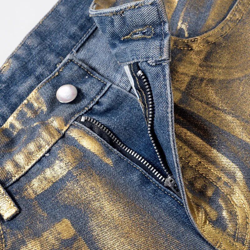 Mejora tu estilo con unos jeans rectos plateados y dorados metálicos
