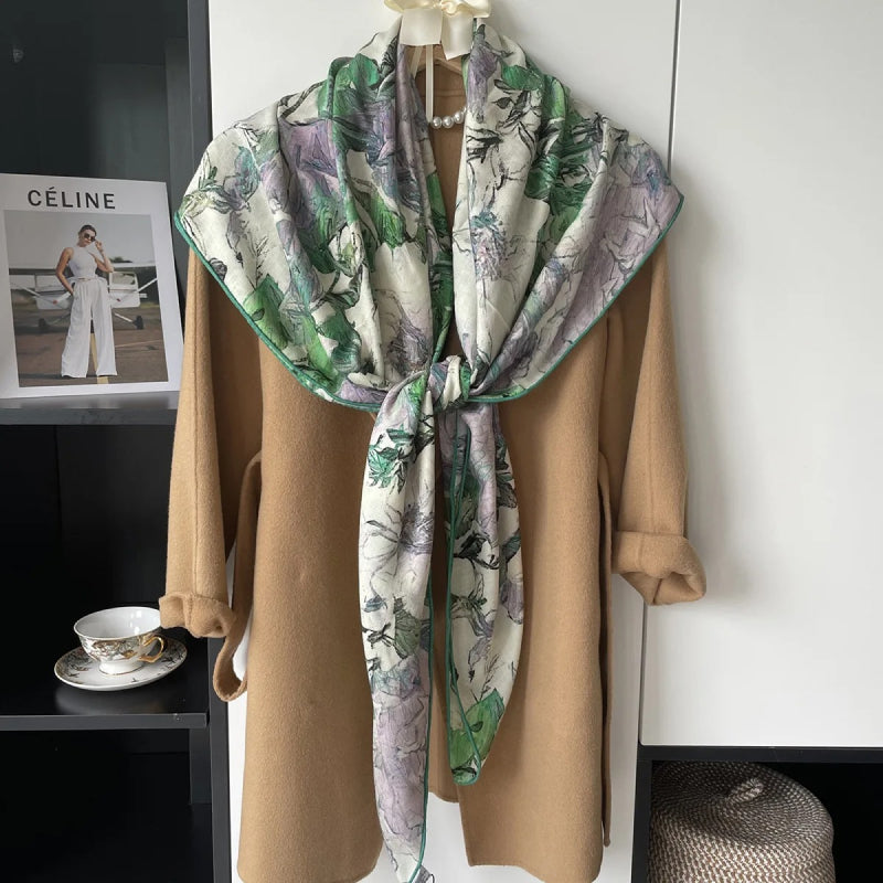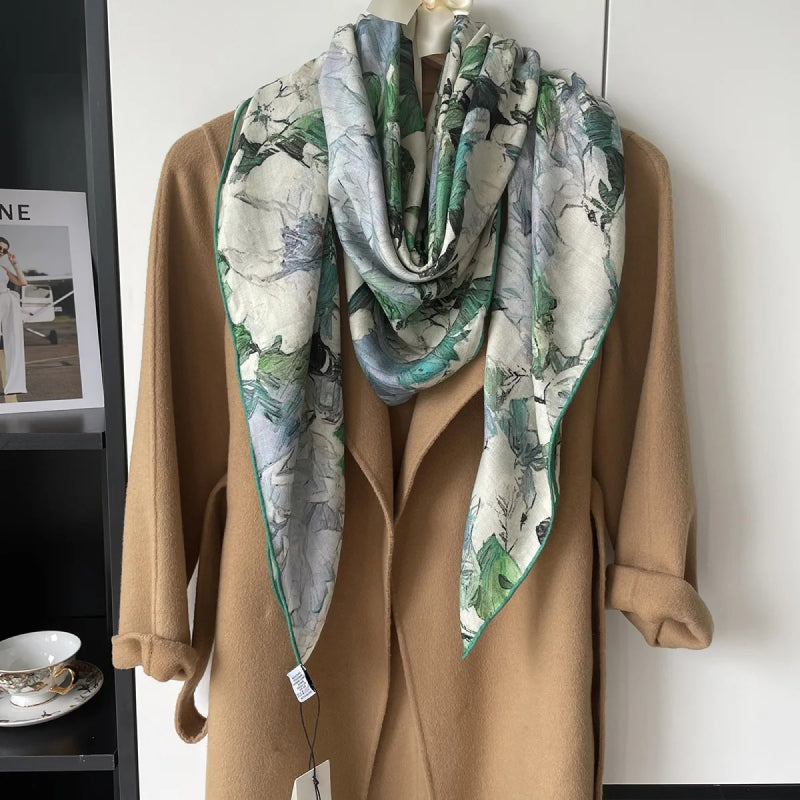 Mejora tu guardarropa con esta impresionante bufanda con estampado de doble cara. Elaborada con una mezcla de seda y cachemira de primera calidad, este lujoso accesorio combina suavidad y calidez con una elegancia atemporal. El rico estampado inspirado en una pintura al óleo agrega un toque artístico, lo que hace de esta bufanda una pieza perfecta para cualquier atuendo. Ya sea que te vistas elegante para una ocasión especial o para agregar un toque de clase a tu look informal, esta bufanda está diseñada para mantenerte abrigada y lucir elegante sin esfuerzo.Características principales