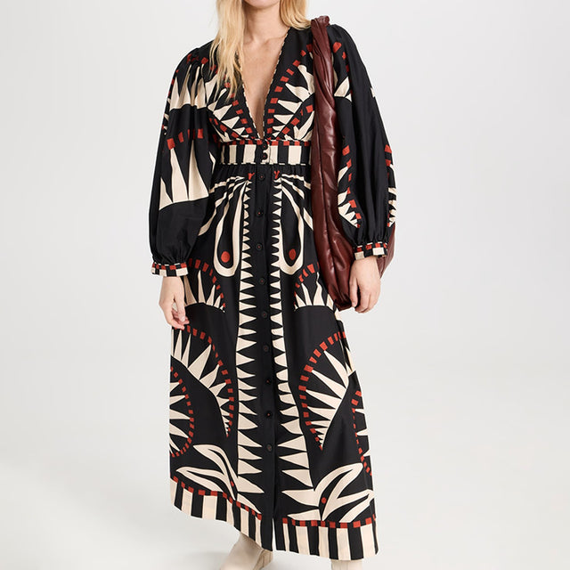 Vestido largo con cintura ajustada y temperamento a la moda con estampado de escote en V europeo y americano