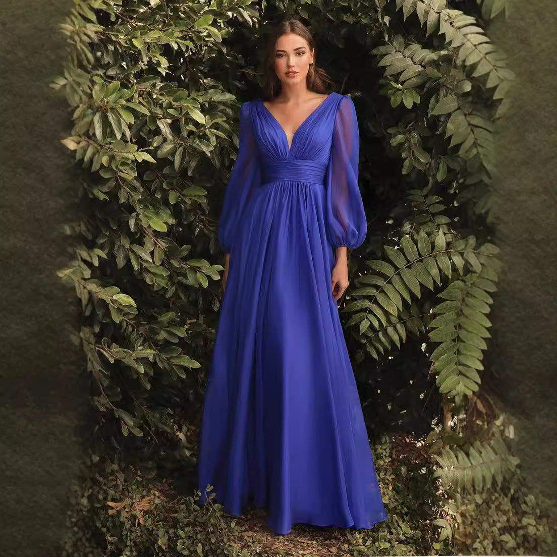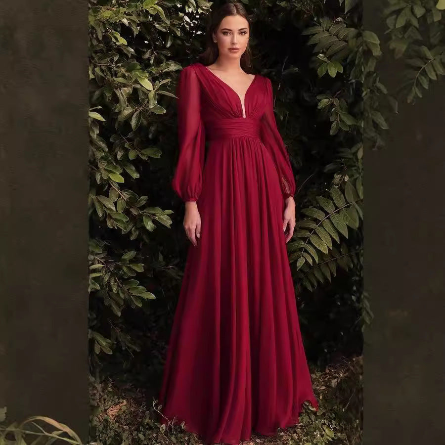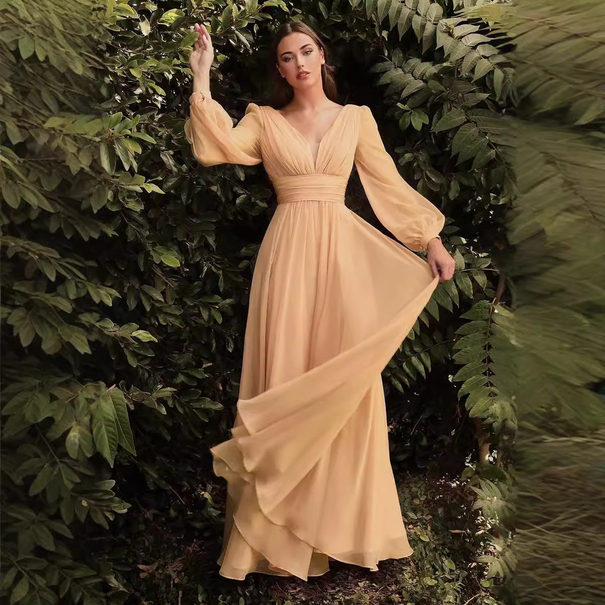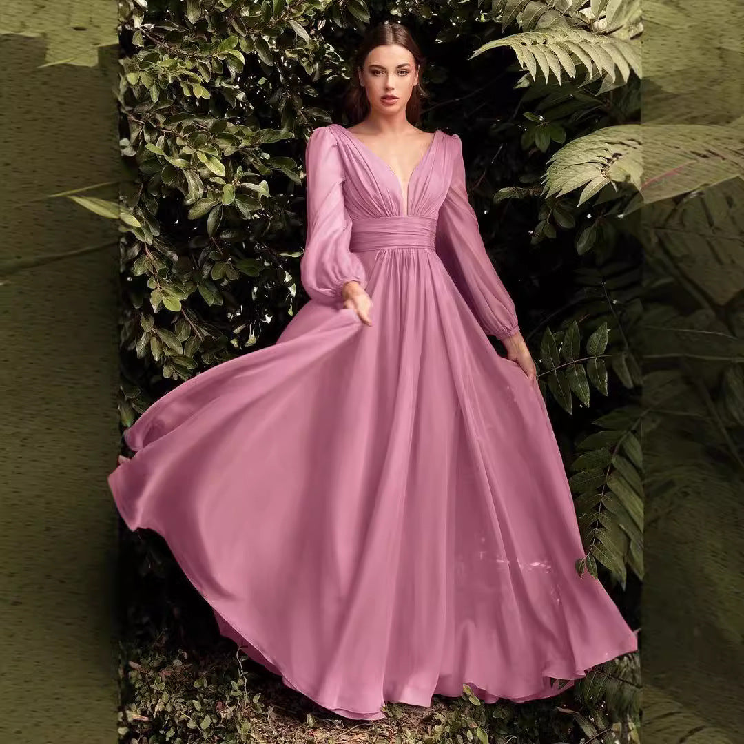 Vestido sexy de gasa con escote en V profundo y manga larga