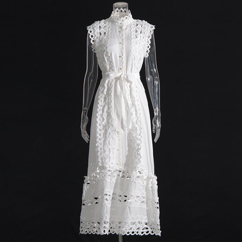 Vestido largo de color liso con cuello redondo, sin mangas, diseño calado y transparente para mujer - Blanco / S está agotado y se enviará tan pronto como vuelva a estar disponible.