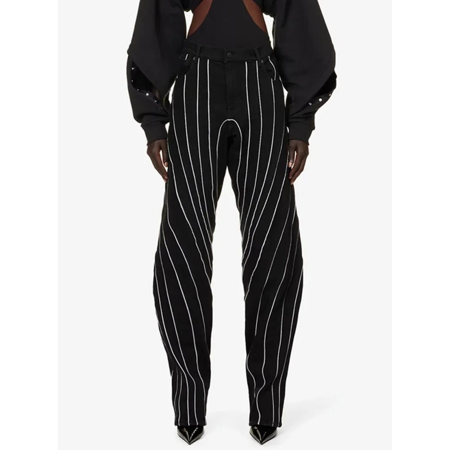 Nuestros jeans cuentan con una mezcla única de algodón y poliéster, lo que garantiza comodidad y durabilidad. El diseño de cintura alta ofrece un ajuste favorecedor, mientras que el corte recto de la pierna garantiza un look atemporal. El empalme de tiras reflectantes añade un toque vanguardista, lo que distingue a estos jeans de los jeans habituales. Además, su lavado medio y su cierre de bragueta con botones los hacen prácticos y elegantes.Diseñado para todas las estaciones