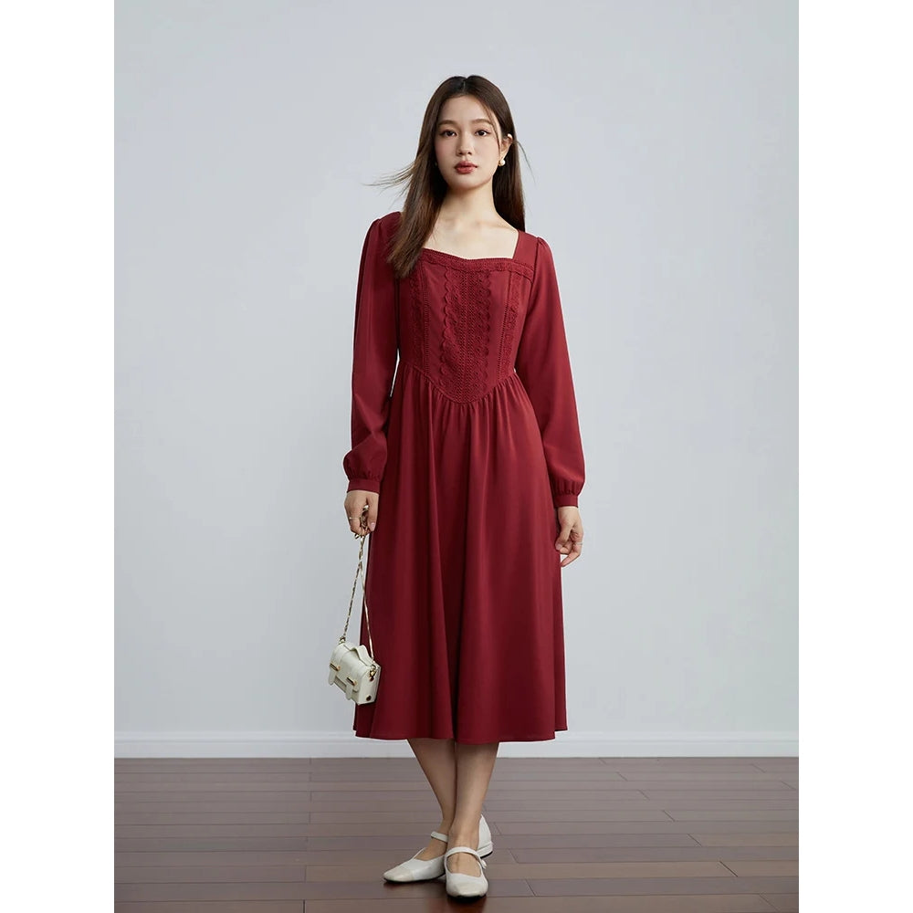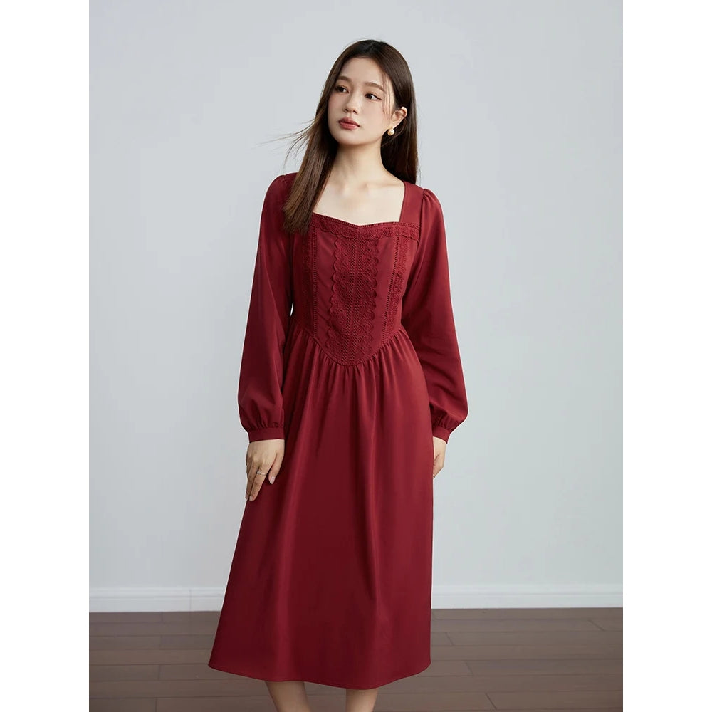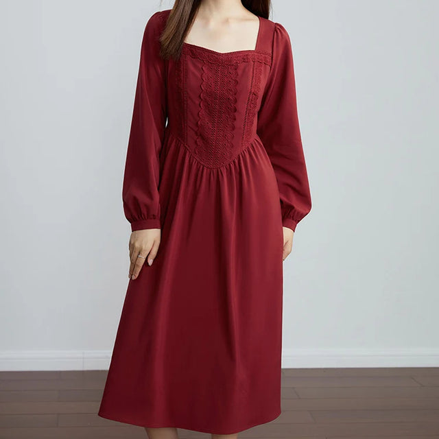 Vestido retro rojo de manga larga con escote cuadrado y decoración de encaje
