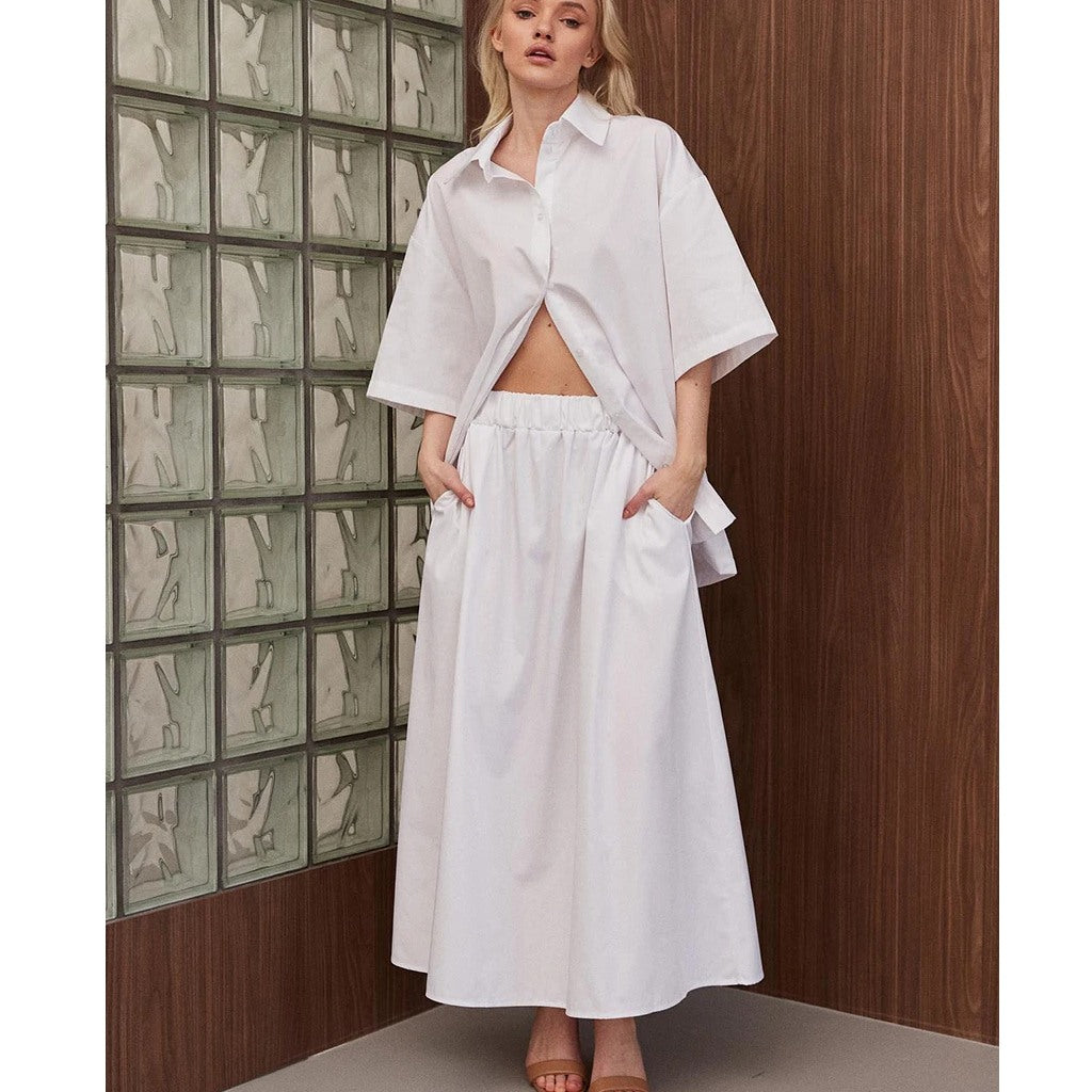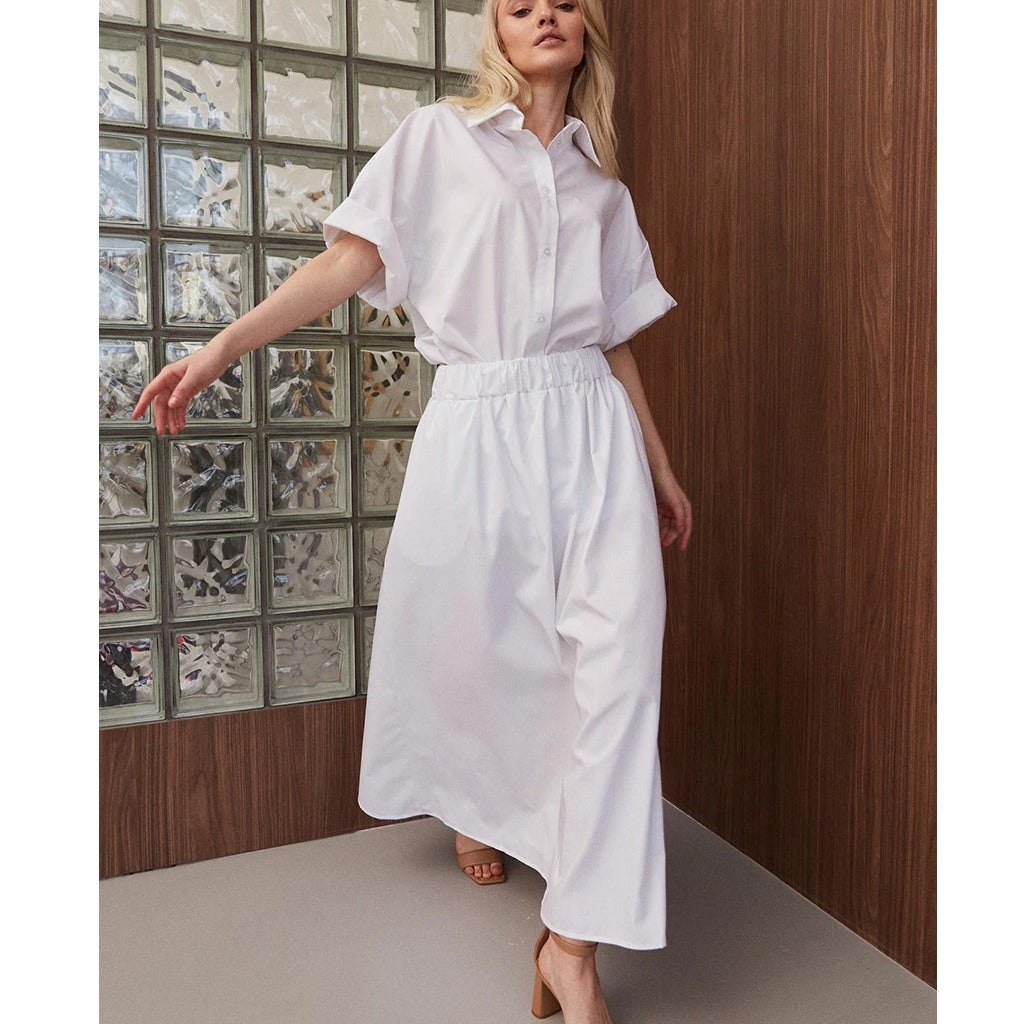 Mejora tu guardarropa de verano con este elegante y cómodo conjunto de dos piezas. Perfecto para cualquier ocasión, este conjunto combina una camisa de manga tres cuartos con una falda midi de cintura alta, creando un look elegante y relajado a la vez. Ya sea que vayas a un brunch informal, a un día en la oficina o a una salida nocturna, este conjunto te garantiza un aspecto elegante sin esfuerzo.