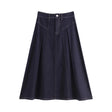 Falda midi elegante de mezclilla oscura con cintura alta y corte en A para mujer