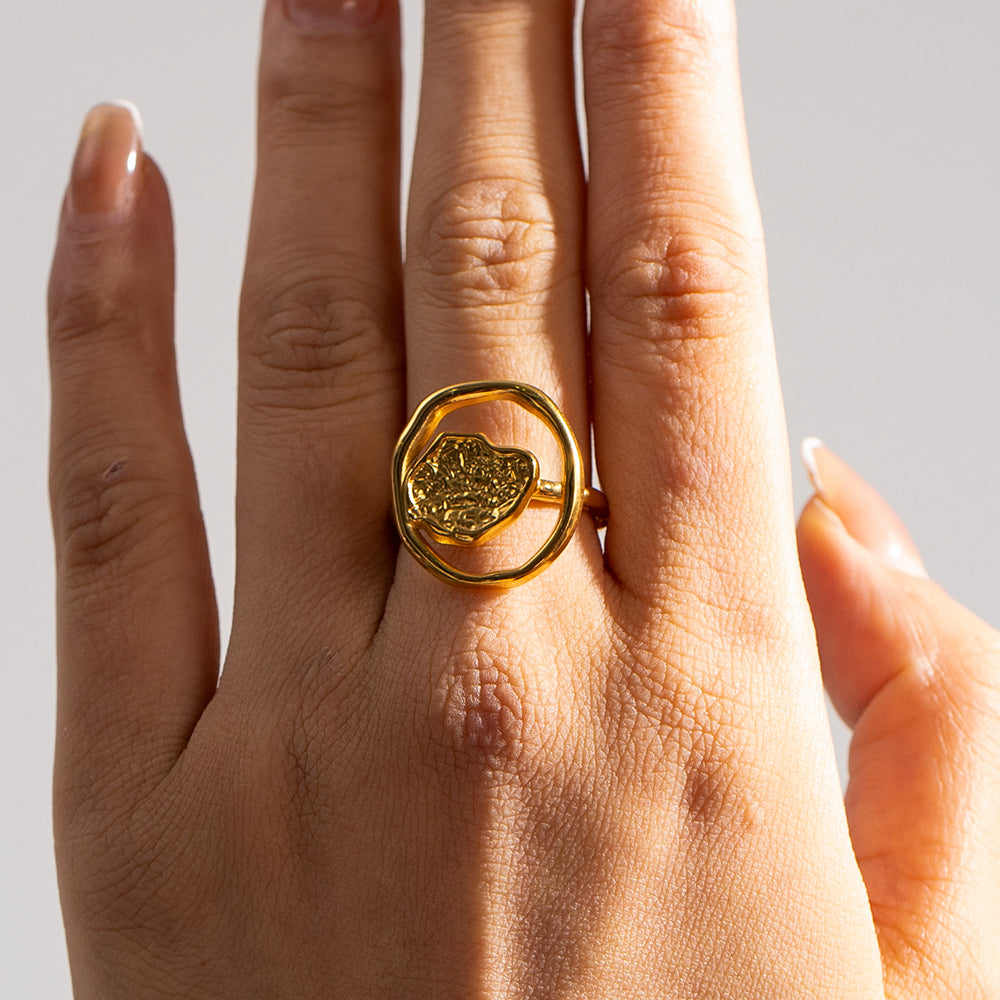 Hecho de acero inoxidable de alta calidad y recubierto de lujoso oro de 18 quilates, este anillo presenta un diseño hueco tallado único que es a la vez intrincado y llamativo. Su diámetro interior de 1,70 cm garantiza un ajuste cómodo, mientras que su estructura ligera de 3,75 gramos garantiza facilidad de uso durante todo el día. No sólo es hermoso, sino que está diseñado para resistir los elementos, siendo resistente al agua y al deslustre.