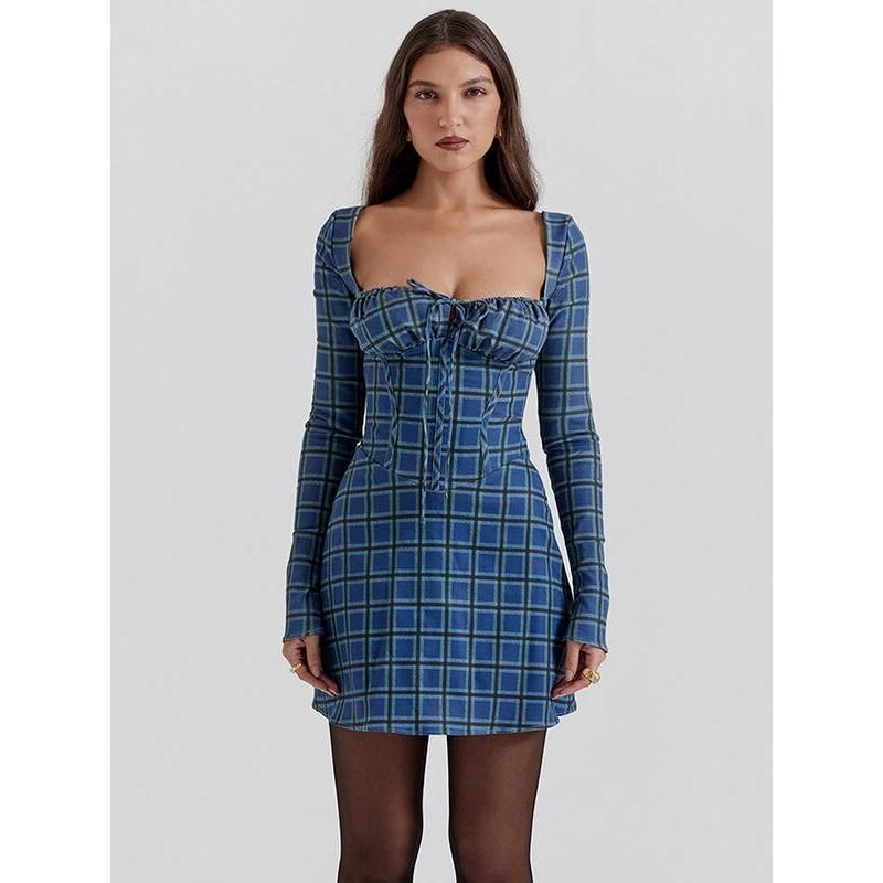 Minivestido elegante de tartán sin espalda con cuello cuadrado y detalle de cordones - C / S está agotado y se enviará tan pronto como vuelva a estar disponible.