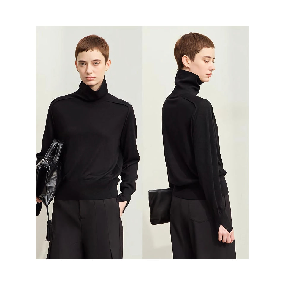 Este suéter de cuello alto se destaca por su diseño minimalista y atención al detalle. La decoración empalmada y el puño abierto le dan un toque moderno a una silueta clásica, lo que lo convierte en una pieza destacada en tu guardarropa. La combinación de lana, poliéster y acrílico garantiza una sensación acogedora y cómoda, mientras que la ligera elasticidad proporciona el ajuste perfecto. Ideal para usar en capas o por sí solo, este suéter es lo suficientemente versátil para varias ocasiones, desde salidas informales hasta eventos más formales.