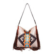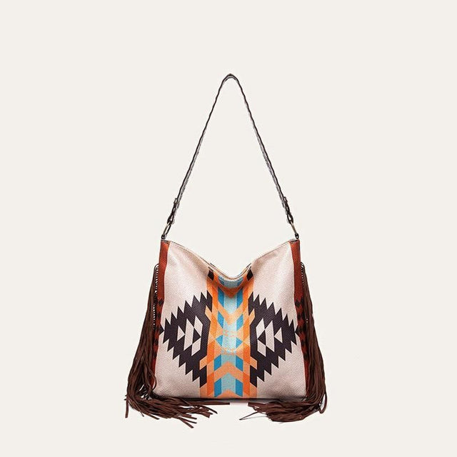 Este bolso destaca por su diseño único de inspiración boho, que combina elementos casuales y artísticos. La combinación de un patrón geométrico con tejidos coloridos y detalles de flecos crea una apariencia llamativa que es a la vez moderna y atemporal. Además, su practicidad es inigualable, con un interior espacioso y un uso versátil como bolso cruzado, bandolera o hobo.
