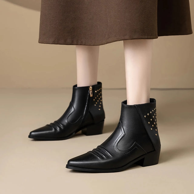 Nuestras botas vaqueras hasta el tobillo están diseñadas para quienes aprecian tanto el estilo como la sustancia. El tacón cuadrado alto (de 5 a 8 cm) proporciona la elevación justa, lo que mejora tu postura y confianza. El patrón sólido y el elegante color negro hacen que estas botas sean lo suficientemente versátiles como para combinarlas con jeans, faldas o vestidos, lo que garantiza que te veas elegante sin esfuerzo sin importar la ocasión. Ideales para otoño e invierno, estas botas mantienen tus pies cálidos y cómodos a la vez que marcan tendencia. La parte superior y la caña de cuero vacuno genuino prometen durabilidad, mientras que la suela de goma ofrece excelente tracción y estabilidad en diversas superficies.