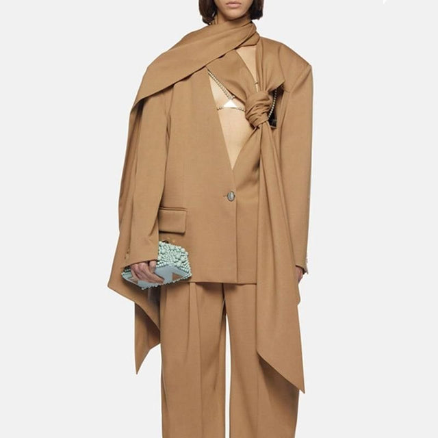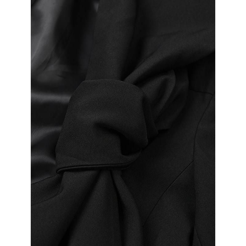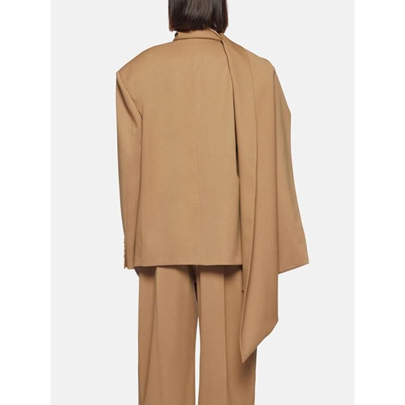 Esta chaqueta es más que una simple prenda de vestir; es una declaración. El exclusivo cuello tipo bufanda asimétrico añade un toque de elegancia, mientras que las mangas amplias y retorcidas aportan un toque moderno al diseño clásico del blazer. Confeccionado con poliéster de alta calidad, ofrece una ligera elasticidad para mayor comodidad sin comprometer el estilo. Su patrón sólido y su largo regular lo hacen versátil para diversas ocasiones.