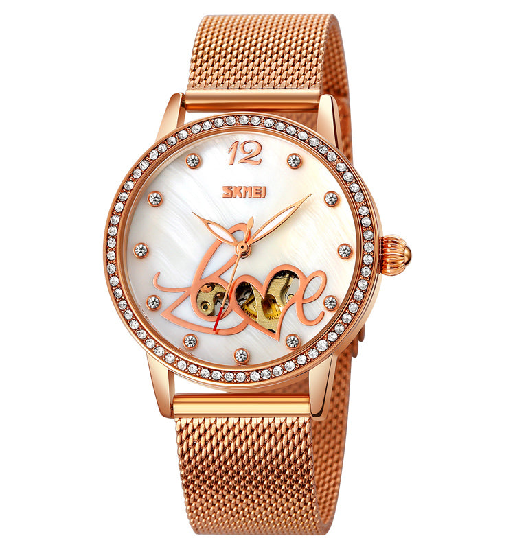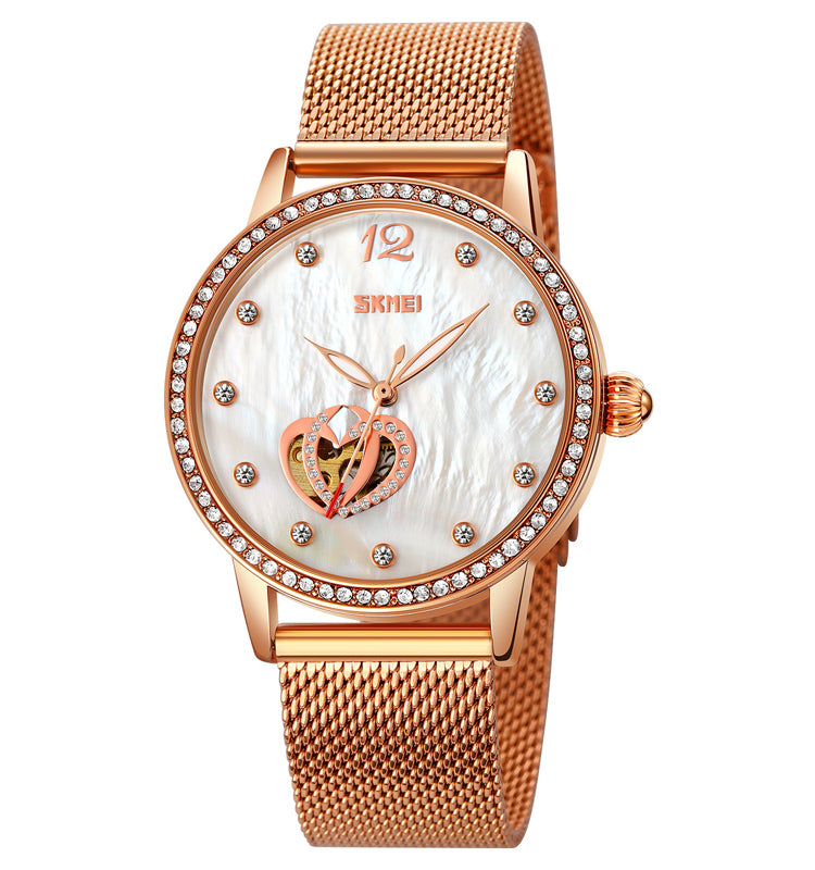 Reloj Luminoso De Oro Rosa Con Esfera De Nácar Y Diamantes