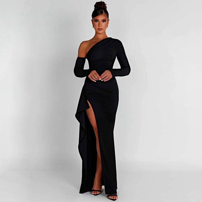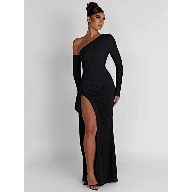 Lo que distingue a este vestido es su combinación única de atrevimiento y clásico. El hombro oblicuo y el diseño sin espalda ofrecen un toque moderno a la elegancia tradicional, mientras que el ligero estiramiento del tejido garantiza un ajuste favorecedor para todo tipo de cuerpo. El corte hasta los tobillos combinado con la abertura hasta los muslos proporciona un equilibrio perfecto entre modestia y encanto, convirtiéndolo en una pieza atemporal en tu guardarropa.Abraza tu elegancia interior
