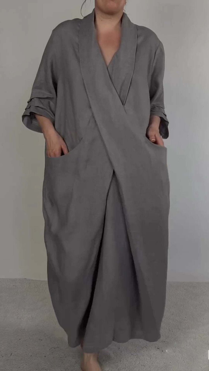 Vestido de lino con escote en V y bolsillos grandes para mujer