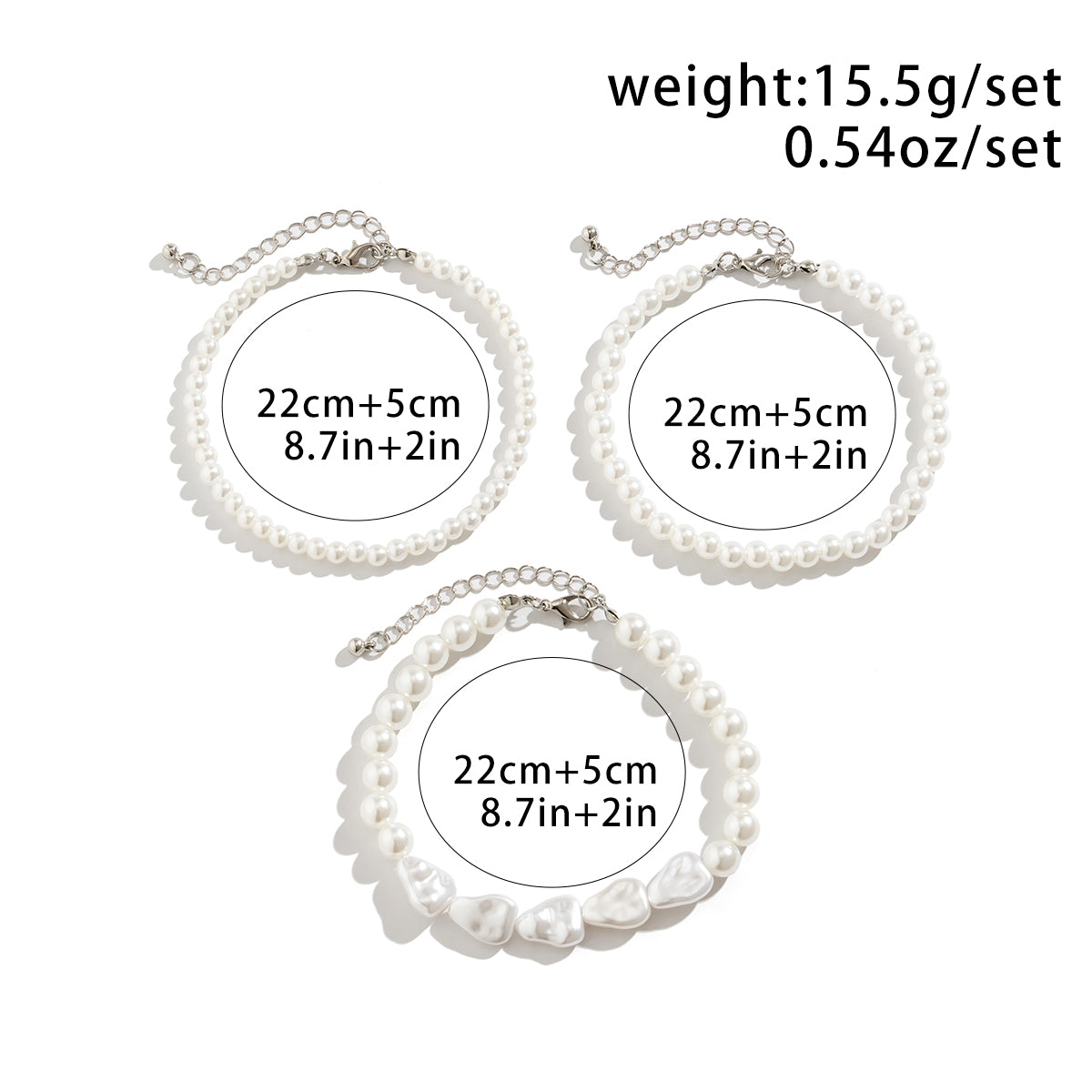 Cada tobillera está meticulosamente ensamblada con perlas de imitación de alta calidad, de color blanco que brilla con un acabado lustroso. El diseño de múltiples capas crea una apariencia lujosa y texturizada que rodea elegantemente su tobillo, lo que lo convierte en un accesorio perfecto para tacones altos o elegancia descalza en costas arenosas.Características del producto