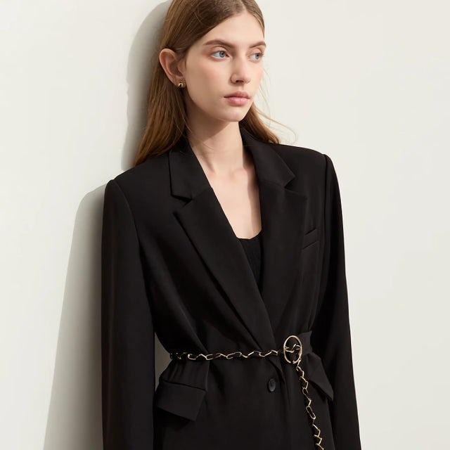 Entra en las estaciones frías con gracia y estilo con nuestro abrigo largo minimalista. Perfecto para otoño e invierno, este abrigo largo presenta un elegante cuello de solapa y un cinturón de cadena único, que ofrece un toque moderno a la prenda de abrigo clásica. Su diseño holgado garantiza comodidad sin comprometer la elegancia, lo que lo convierte en una incorporación esencial a tu guardarropa.