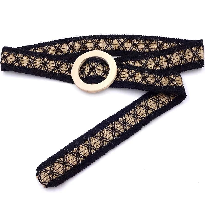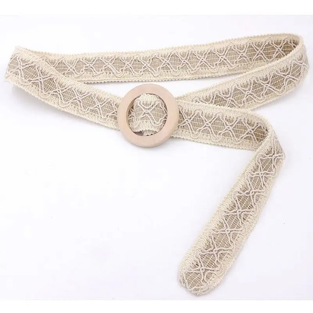 Cinturón de encaje de crochet estilo bohemio con hebilla de madera