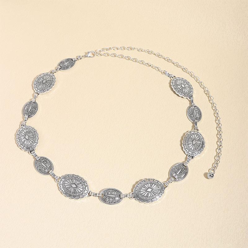 Transforma cualquier atuendo en una declaración de moda con el cinturón de cadena de metal para mujer Retro Chic. Este accesorio atrevido y elegante combina un diseño de inspiración vintage con un toque moderno, lo que lo convierte en el toque final perfecto para cualquier look. Con detalles circulares intrincadamente tallados, esta cadena para la cintura irradia sofisticación al tiempo que agrega un toque de alta costura a tu guardarropa. Fabricado con metal duradero, este cinturón no solo realza tu silueta, sino que también promete un uso duradero para todas tus ocasiones.