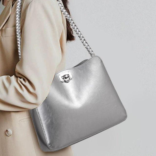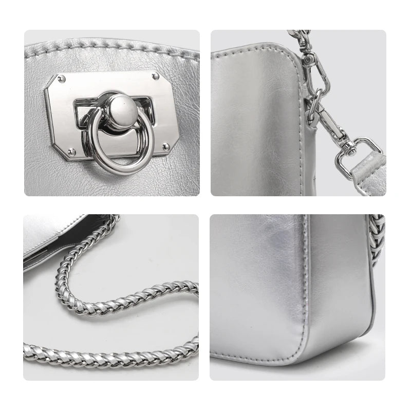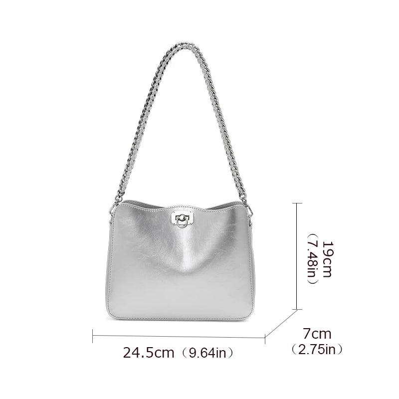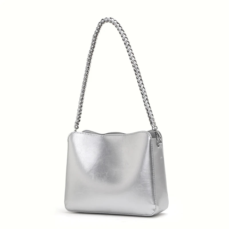 Descubra la combinación perfecta de elegancia y funcionalidad con este sofisticado bolso de hombro con cadena, elaborado con lujosa piel de vacuno. Su diseño elegante y cuadrado lo convierte en un accesorio versátil, ideal tanto para salidas informales como para eventos especiales. La forma estructurada del bolso, combinada con un impresionante detalle de cadena, agrega un toque de moda, al mismo tiempo que ofrece suficiente espacio para guardar todos sus elementos esenciales. Ya sea que vaya a un brunch, a un evento nocturno o simplemente a hacer recados, este bolso realzará su atuendo sin esfuerzo.