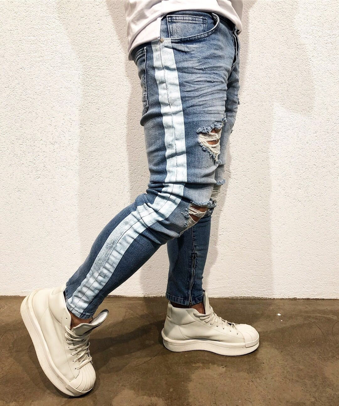 Pantalones de mezclilla ajustados y elásticos con desgarros - Azul / 36 está agotado y se enviará tan pronto como vuelva a estar disponible.