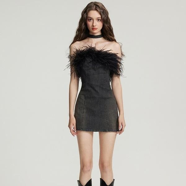 Experimente la combinación única de comodidad y estilo con esta exquisita pieza. Nuestro minivestido cuenta con un favorecedor diseño con hombros descubiertos, adornado con delicadas plumas que añaden un toque de sofisticación. La silueta ceñida al cuerpo, confeccionada con fibras sintéticas de alta calidad, se complementa con un elegante tejido vaquero. Su cintura imperio y su escote palabra de honor realzan tu figura, asegurando un look chic y elegante.