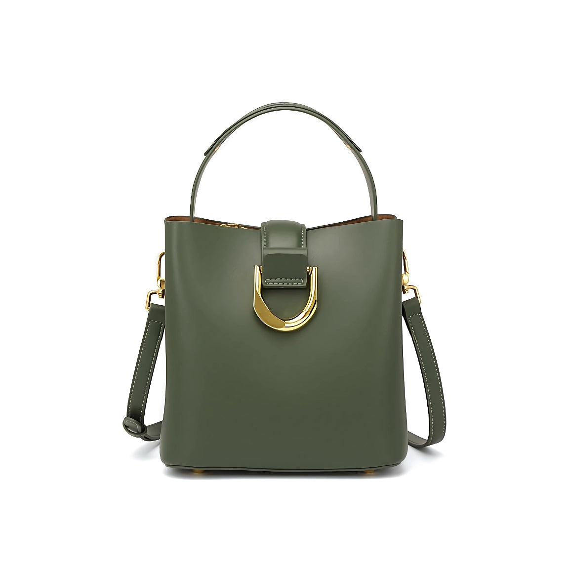 Este versátil bolso es más que una declaración de moda. Su fabricación en piel auténtica de alta calidad garantiza su durabilidad y una sensación de lujo. La suave forma de cubo proporciona un amplio espacio para todos tus objetos esenciales, mientras que el cierre con broche mantiene tus pertenencias seguras. Con un forro de poliéster, el interior es tan resistente como elegante. El bolso cuenta con un bolsillo interior con ranuras para una fácil organización, lo que lo hace perfecto para tus desplazamientos diarios o tus aventuras de fin de semana.