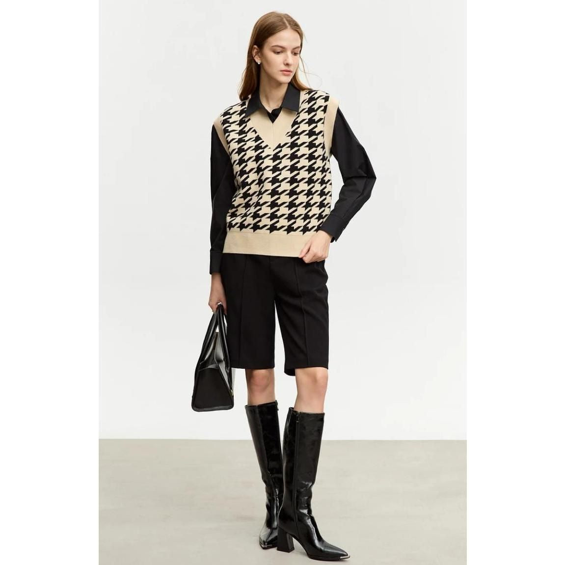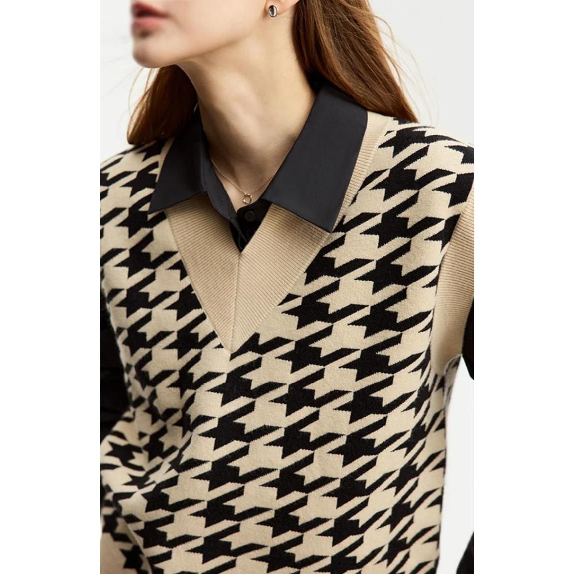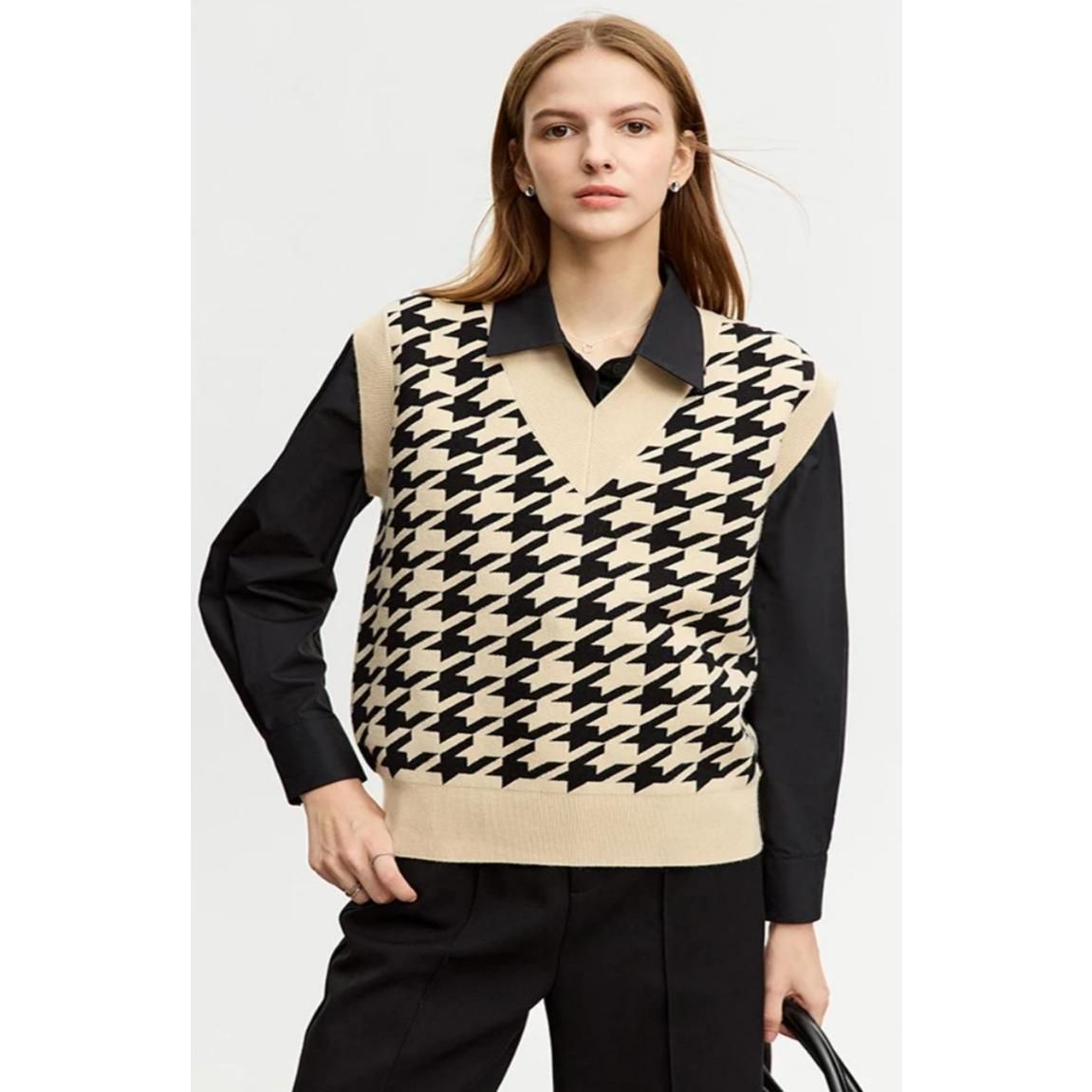 Nuestro chaleco cuenta con una mezcla única de poliéster, nailon, acrílico y viscosa, lo que garantiza comodidad y durabilidad. El cierre del jersey y el largo normal de la prenda ofrecen facilidad de uso y un ajuste que favorece a todo tipo de cuerpo. El intrincado patrón jacquard de mil cuadros de pájaros añade un toque de sofisticación, lo que lo convierte en una opción ideal para la oficina o un día informal.