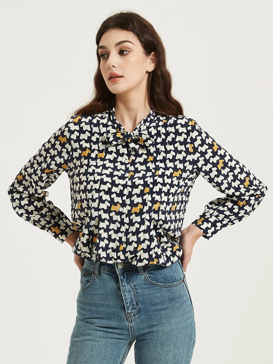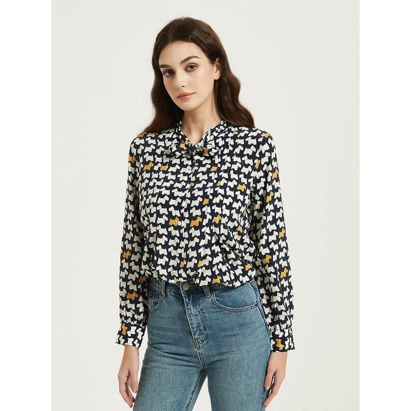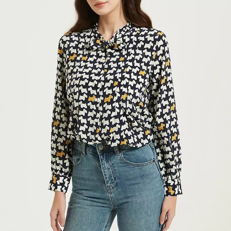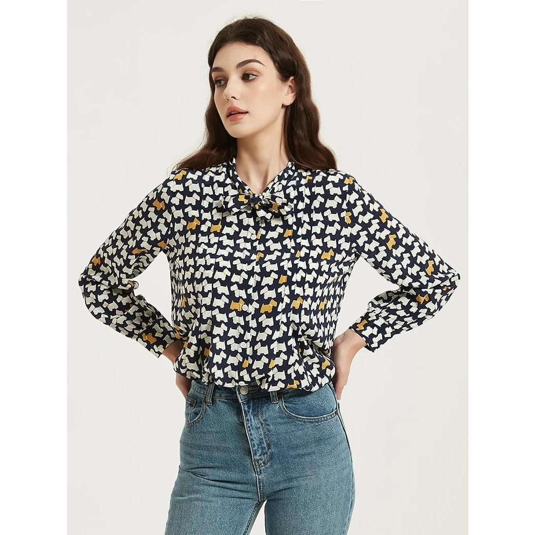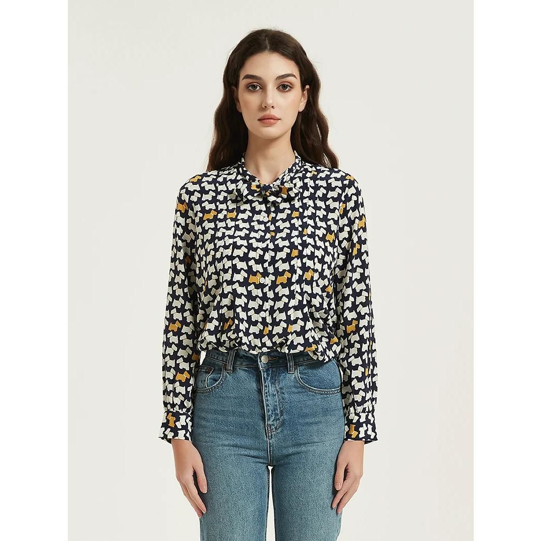 Lo que distingue a esta blusa es su combinación única de estilo, comodidad y versatilidad. La seda de morera proporciona una textura suave y lujosa que se siente increíble contra la piel, mientras que el ajuste regular y el tejido no elástico garantizan una silueta favorecedora para todo tipo de cuerpo. El caprichoso estampado de dibujos animados y el cuello con lazo añaden elementos de estilo distintivos que hacen que esta blusa destaque en cualquier guardarropa.