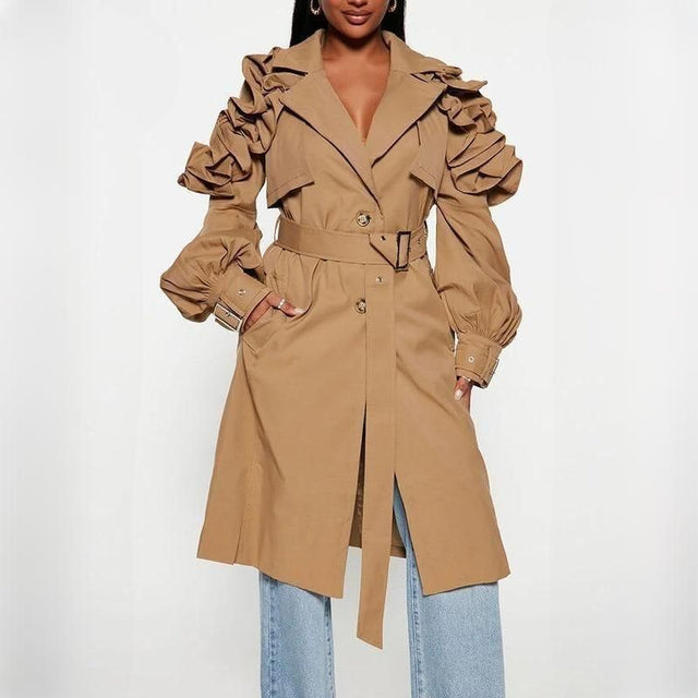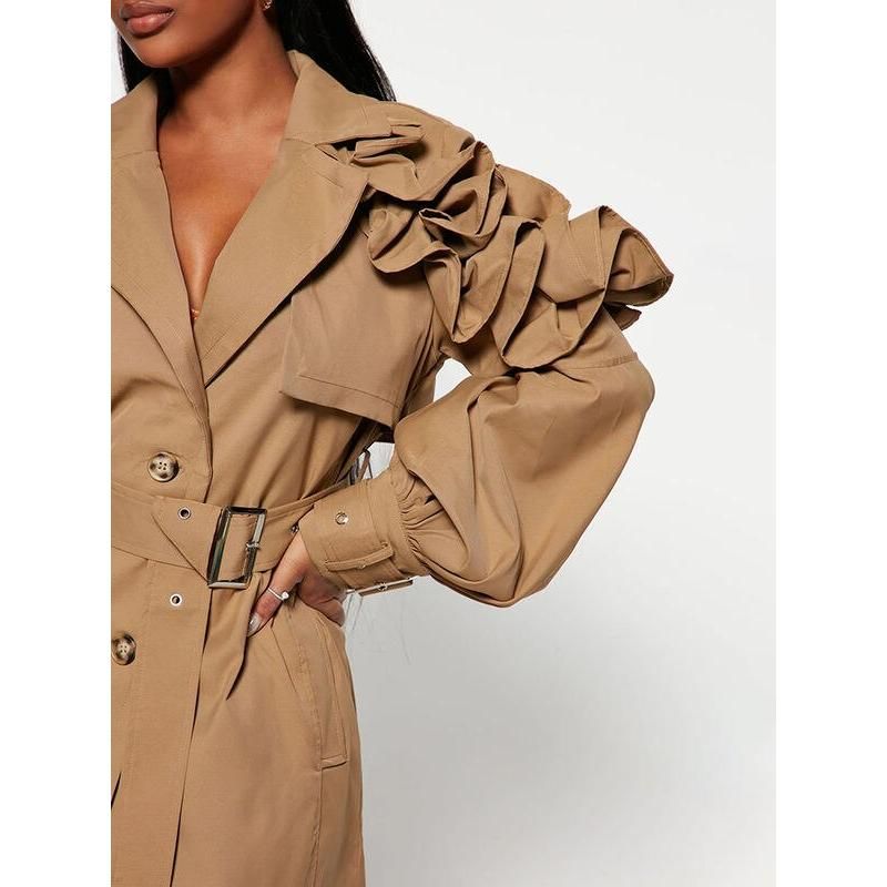 Gabardina elegante con volantes empalmados para mujer - Caqui / L está agotado y se enviará tan pronto como vuelva a estar disponible.