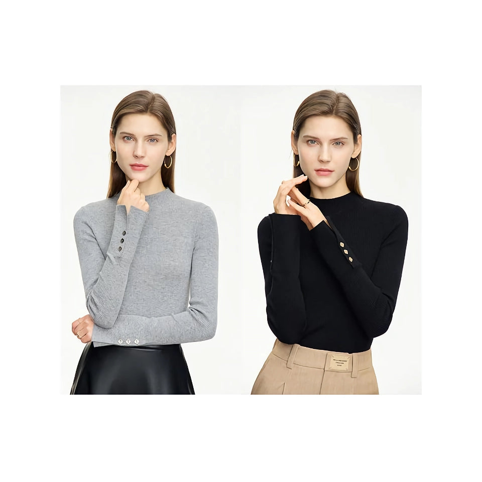 La atención al detalle distingue a este suéter del resto. La combinación de materiales de alta calidad y elementos de diseño únicos, como los puños con aberturas y la hebilla de metal, lo convierten en una pieza destacada. El cuello alto agrega un elemento de sofisticación, mientras que el corte ajustado garantiza que te veas elegante y sin esfuerzo. Este suéter no es solo una prenda de vestir; es una declaración de estilo y elegancia.