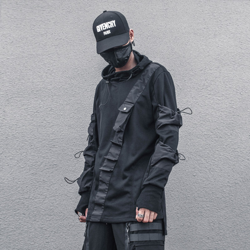Suéter táctico holgado con capucha y cordón para hombre - Negro / S está agotado y se enviará tan pronto como vuelva a estar disponible.