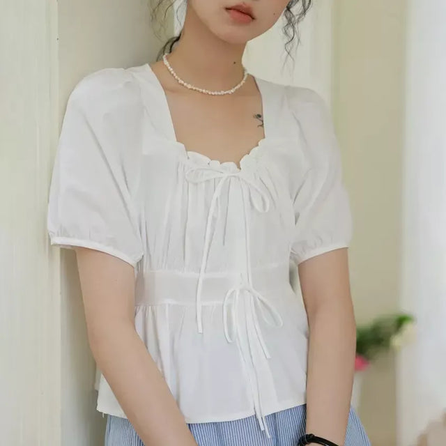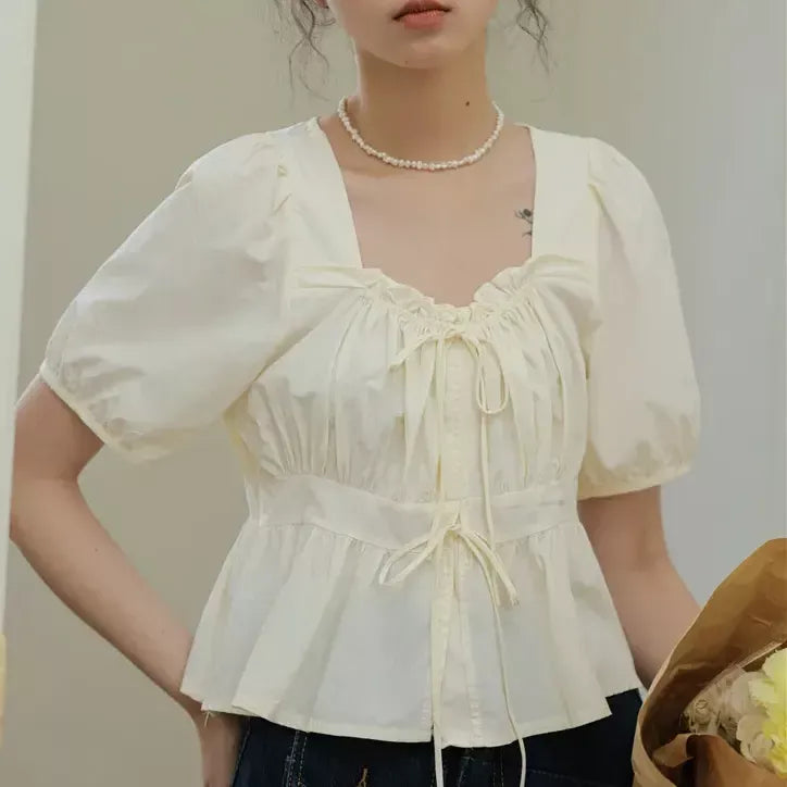 Blusa elegante vintage con cuello cuadrado y manga abullonada