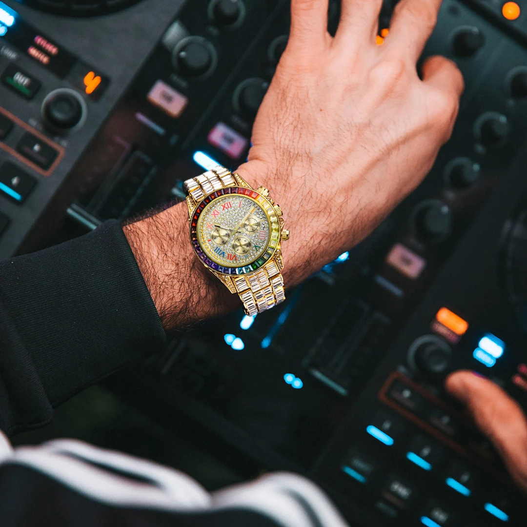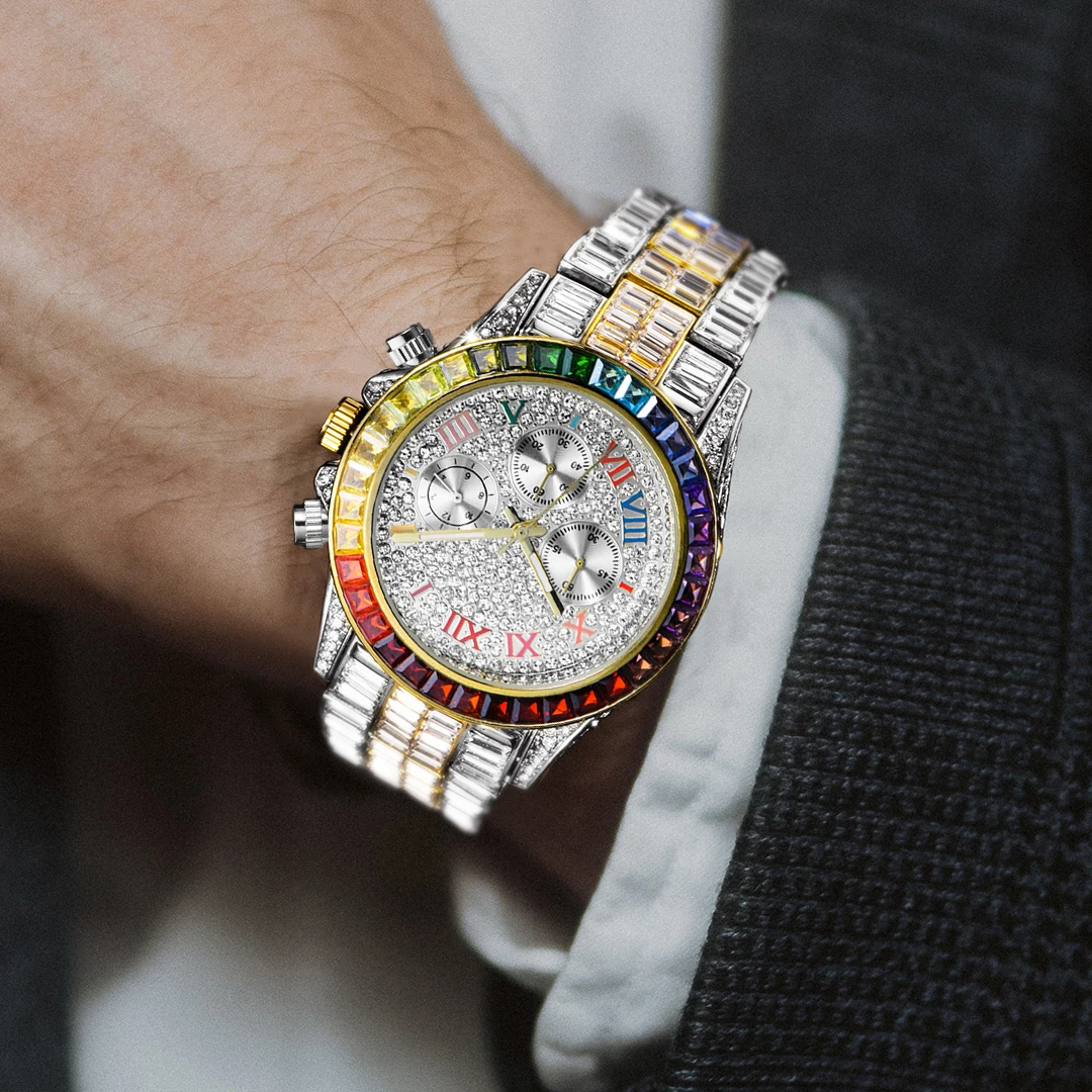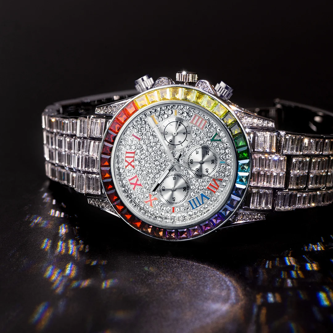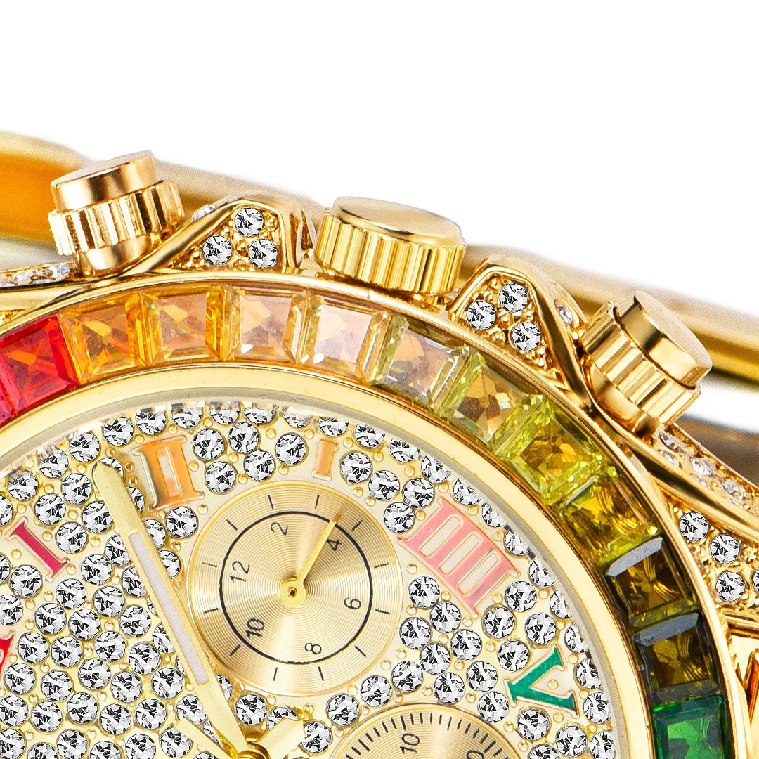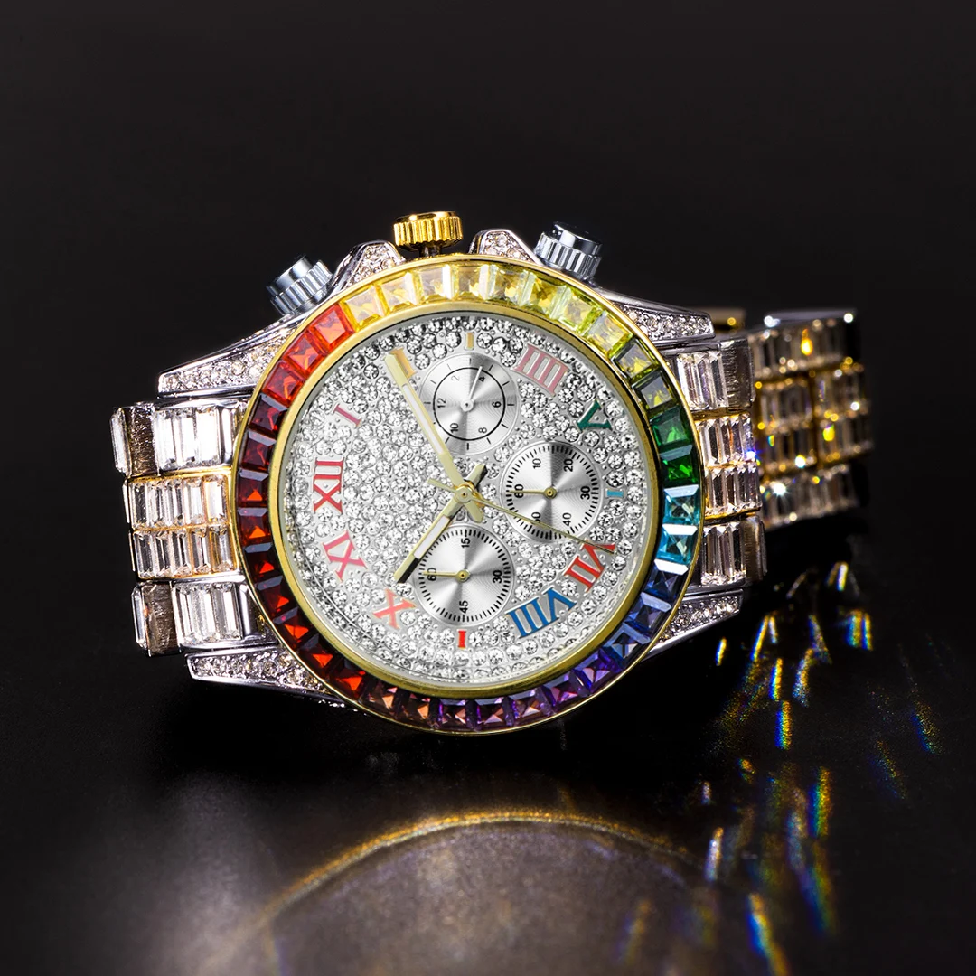 Reloj de cuarzo con tres ojos y diamantes arcoíris