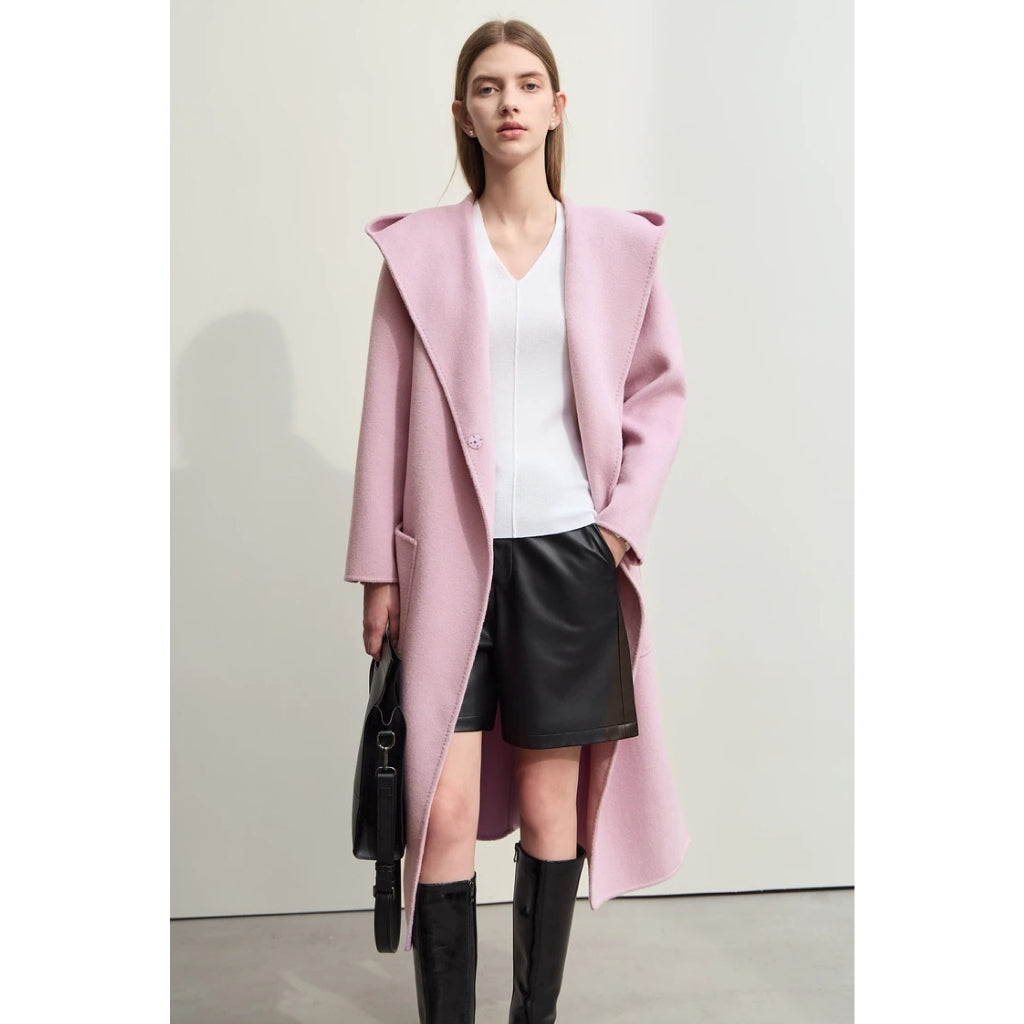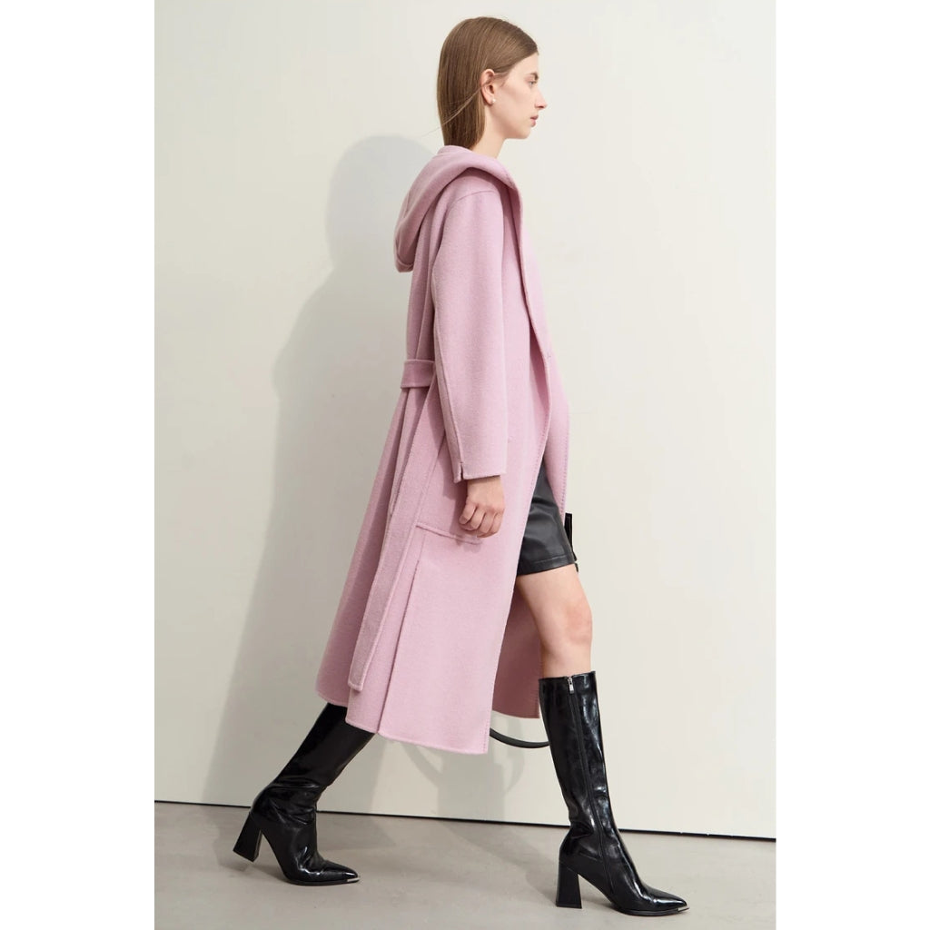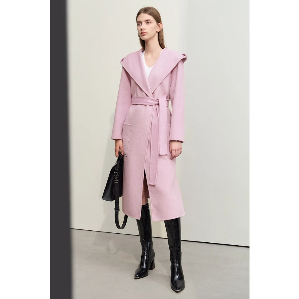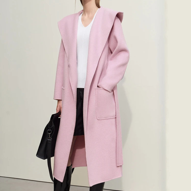 Abrigo largo de lana con capucha y cinturón dividido para mujer de otoño