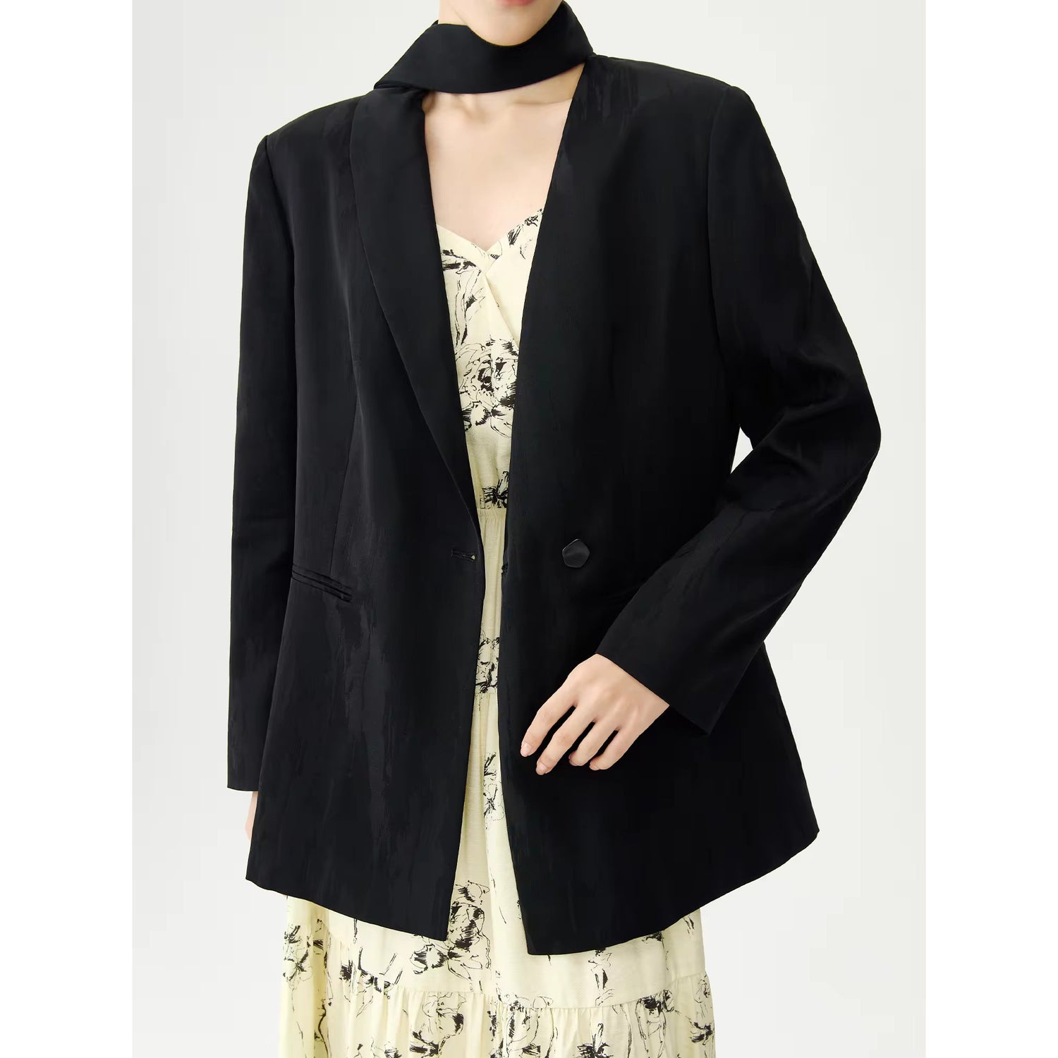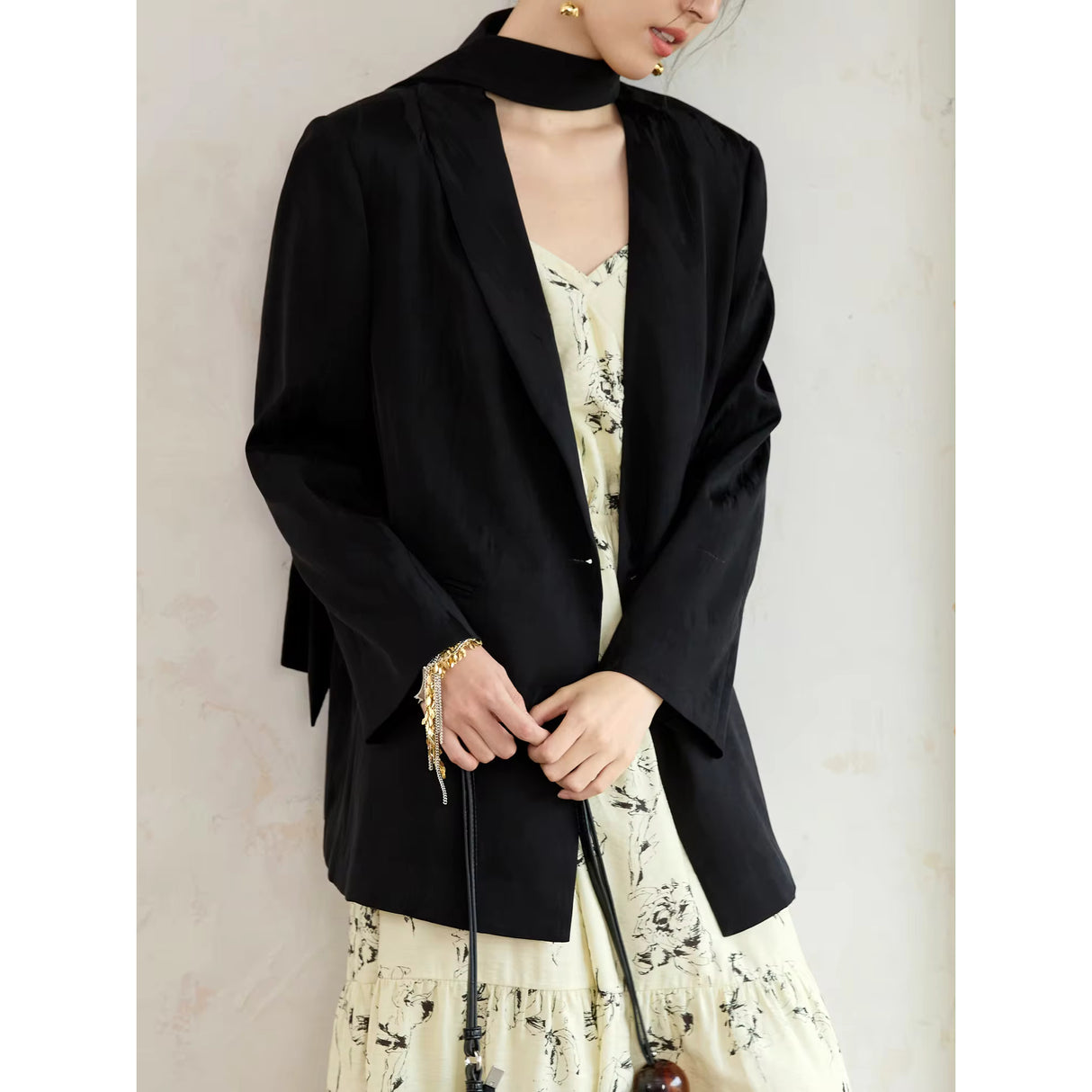 Elegante chaqueta negra con diseño de lazo en el escote para damas de oficina