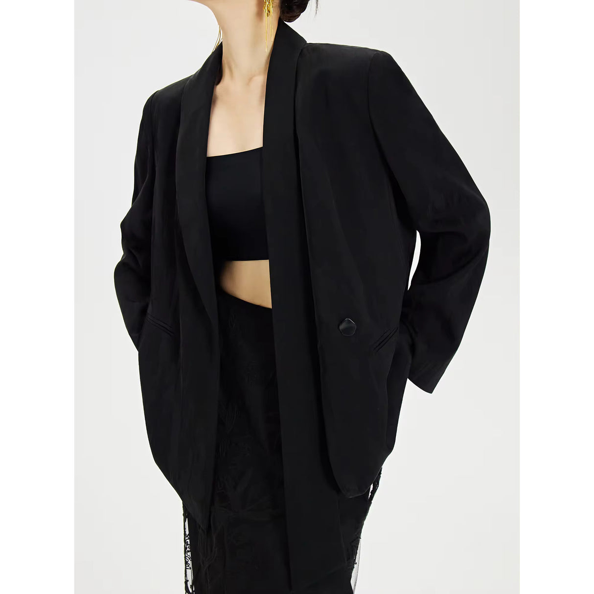 Entra en la temporada de otoño con confianza y elegancia con nuestro impresionante blazer negro, que presenta un sofisticado diseño de lazo en el escote. Este blazer, confeccionado con una mezcla de viscosa, lyocell y lino, está diseñado para la dama de oficina moderna que valora tanto el estilo como la comodidad. El sencillo cierre de un botón y el corte recto de cintura ancha ofrecen un estilo atemporal que complementa cualquier conjunto profesional.