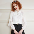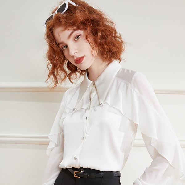 Camisa falbala elegante de manga larga con cuello de perla para mujer