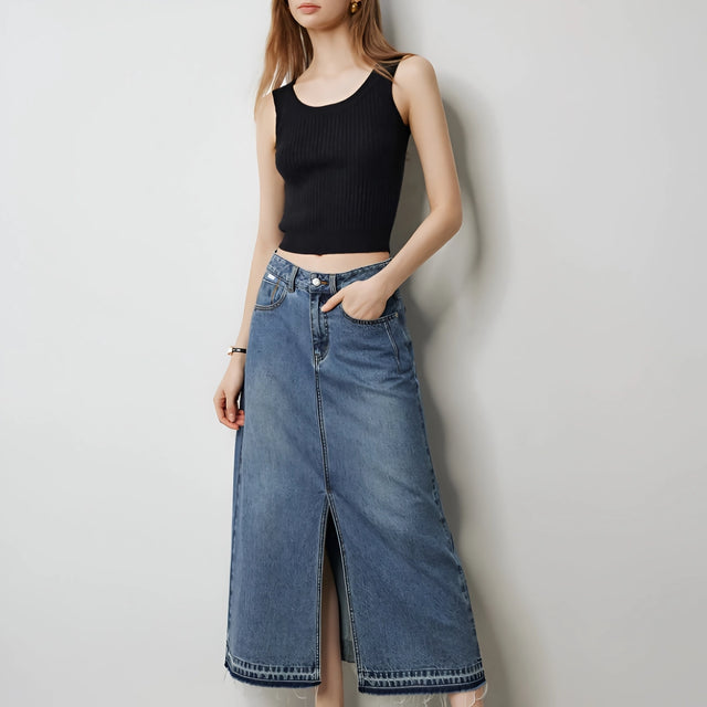 Esta falda es más que una simple prenda de vestir; es una declaración de intenciones. La combinación de denim de alta calidad y detalles de diseño bien pensados ​​garantiza que te verás elegante y te sentirás cómoda durante todo el día. La cintura natural y la silueta en forma de A crean una forma favorecedora, mientras que los bolsillos prácticos ofrecen comodidad sin comprometer el estilo. Lanzada en otoño de 2024, trae las últimas tendencias de moda a tu guardarropa.