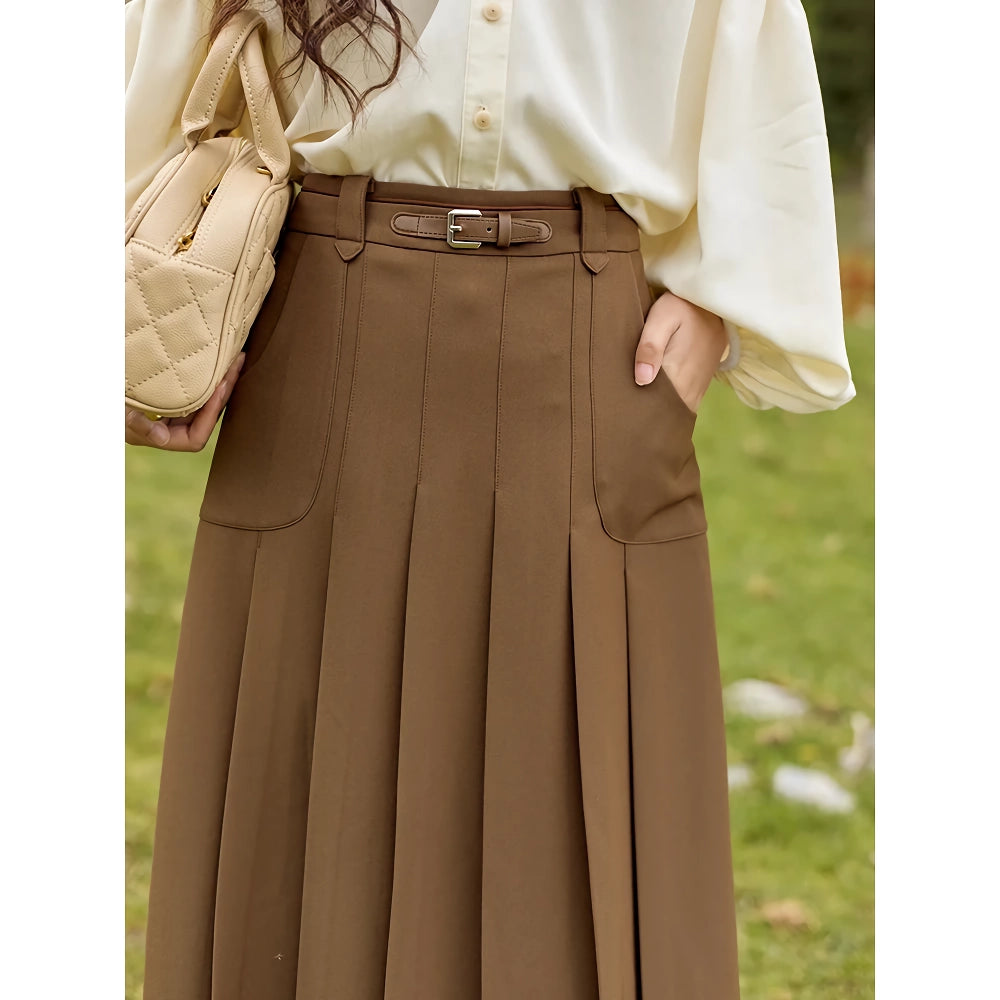 Falda plisada de talle alto con cinturón decorativo y bolsillos