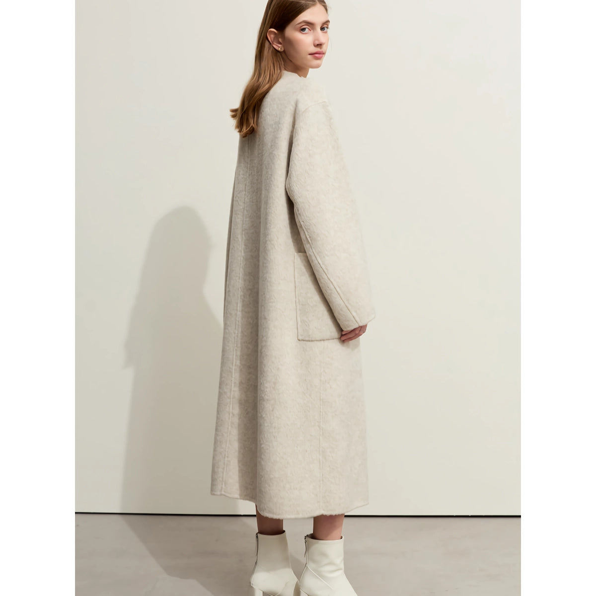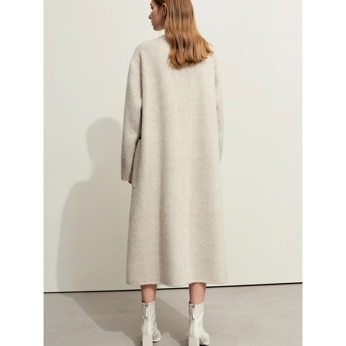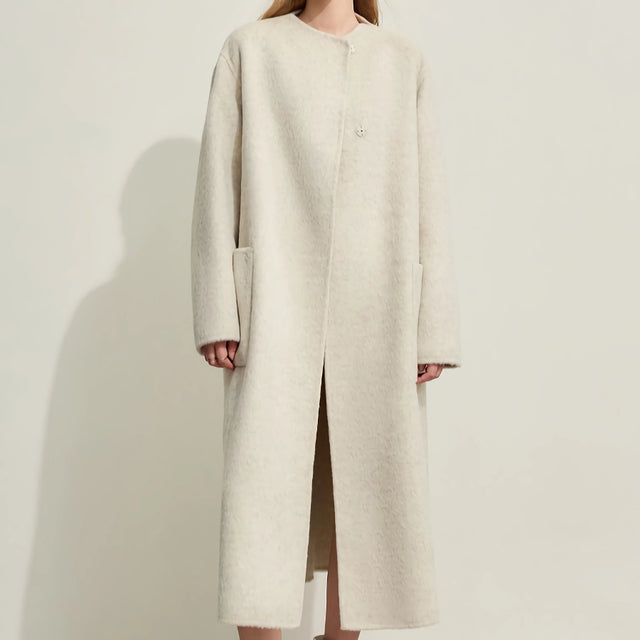 Nuestro abrigo largo minimalista de lana se destaca por su excepcional combinación de materiales, que proporciona una calidez y suavidad superiores. La combinación de lana de oveja, pelo de conejo y seda de morera ofrece una textura única que resulta increíblemente cómoda contra la piel. El cuello alto y el diseño de doble cara le suman al atractivo moderno del abrigo, lo que lo convierte en una pieza destacada en cualquier atuendo.