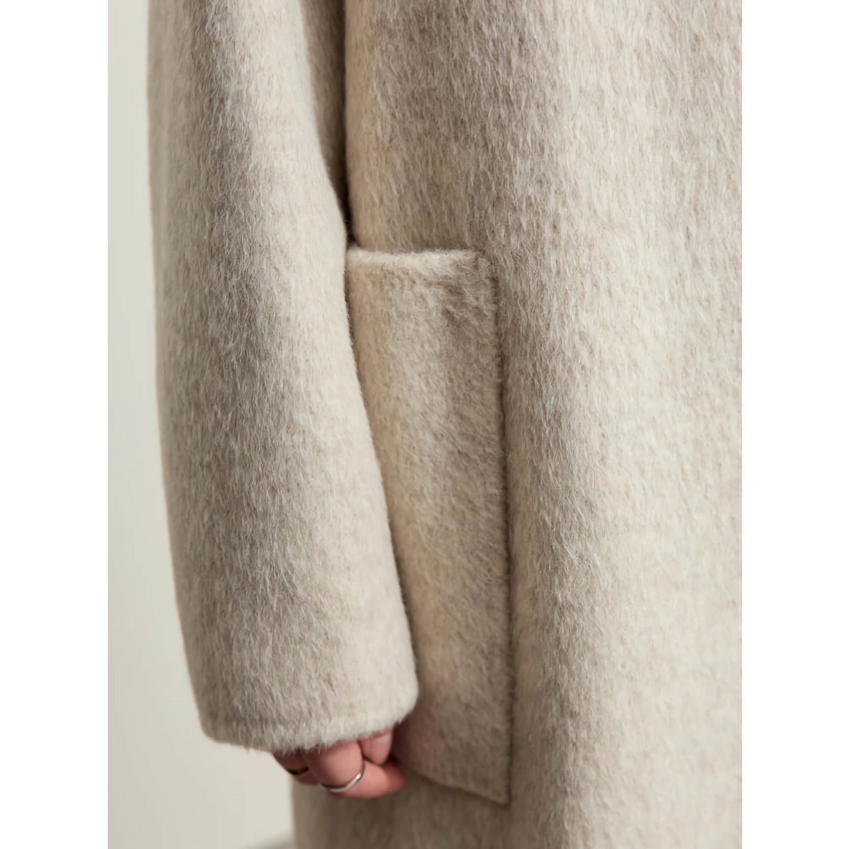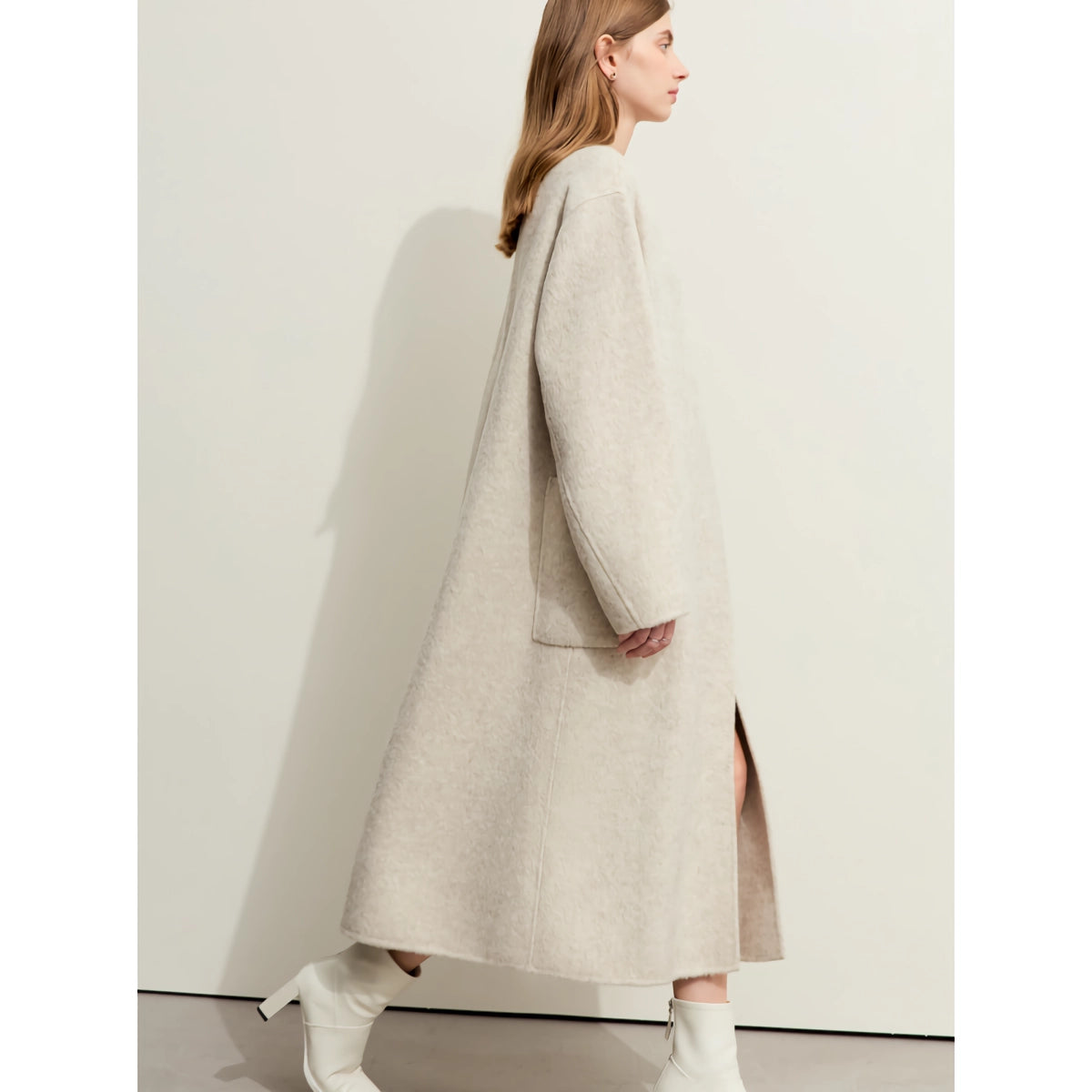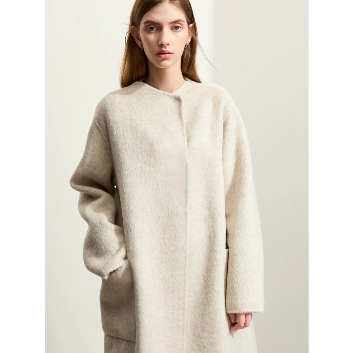 Nuestro abrigo largo minimalista de lana se destaca por su excepcional combinación de materiales, que proporciona una calidez y suavidad superiores. La combinación de lana de oveja, pelo de conejo y seda de morera ofrece una textura única que resulta increíblemente cómoda contra la piel. El cuello alto y el diseño de doble cara le suman al atractivo moderno del abrigo, lo que lo convierte en una pieza destacada en cualquier atuendo.