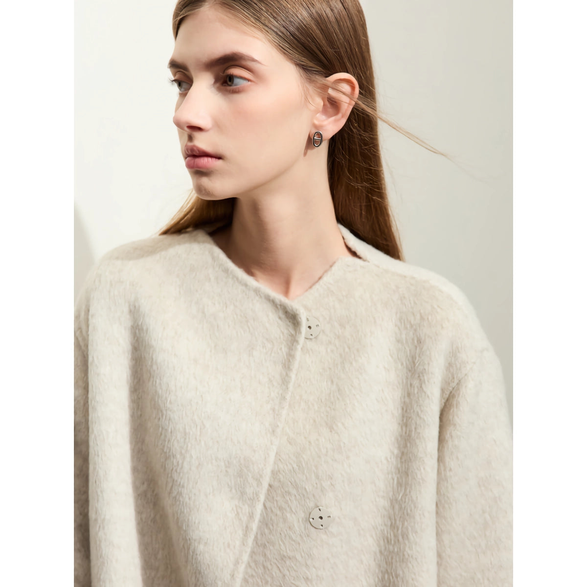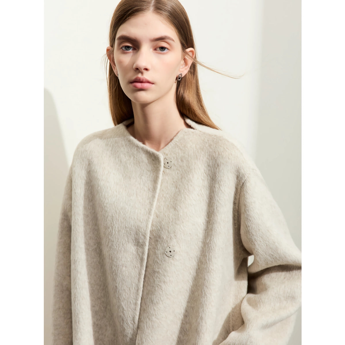 Este abrigo está elaborado meticulosamente con una mezcla de materiales de alta calidad, que incluyen 84 % lana de oveja, 10 % pelo de conejo y 6 % seda morera. El patrón liso y el cuello redondo brindan un aspecto atemporal y versátil, mientras que el cierre de botonadura sencilla agrega un toque de encanto clásico. Las mangas largas y el diseño de cintura ancha ofrecen un ajuste favorecedor para todo tipo de cuerpos, lo que lo convierte en un artículo imprescindible en tu guardarropa de invierno.