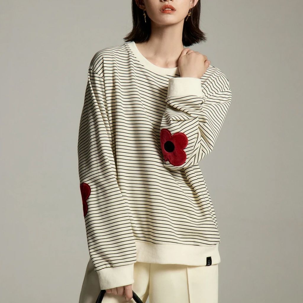 Ya sea que salgas a pasar un día informal con amigos o hagas recados, nuestra sudadera con bordado de flores a rayas blancas y negras para mujer es la elección perfecta. El grosor estándar proporciona la cantidad justa de calidez y el diseño de cuello redondo añade un toque de elegancia a tu look.