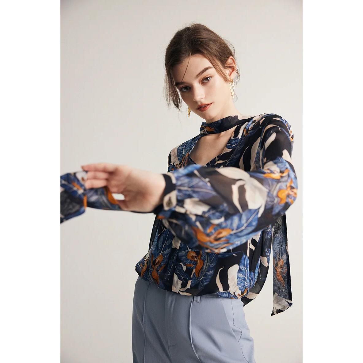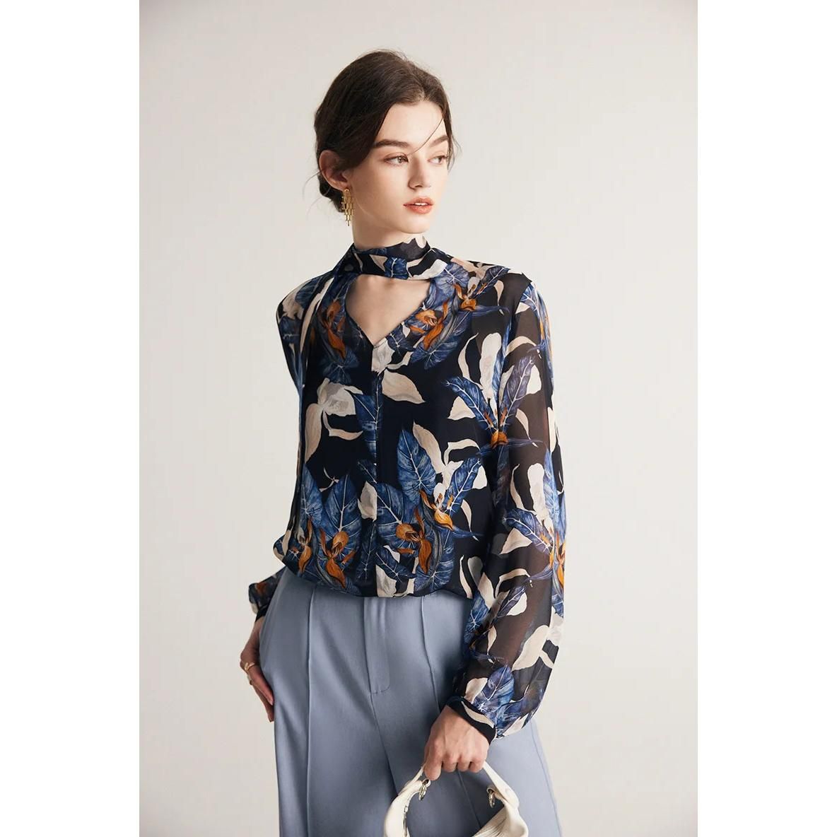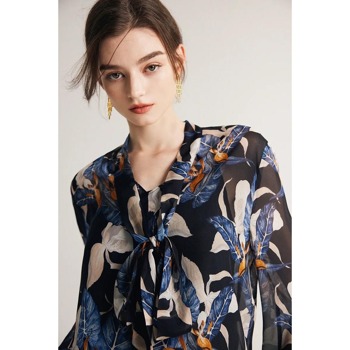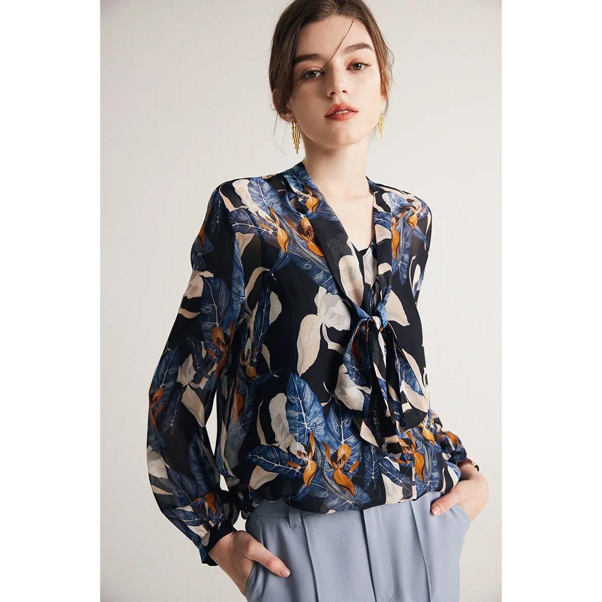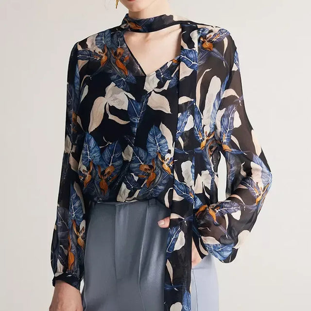 Blusa elegante con cuello de lazo en mezcla de seda