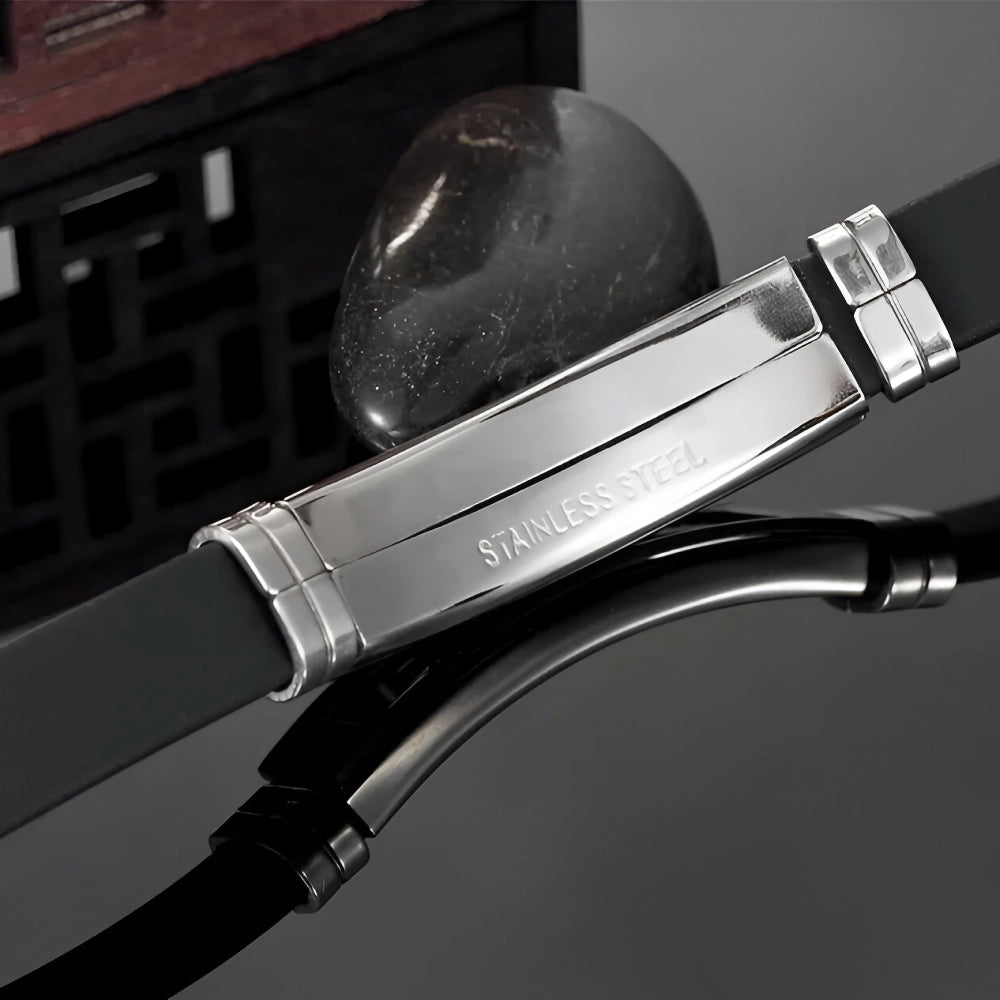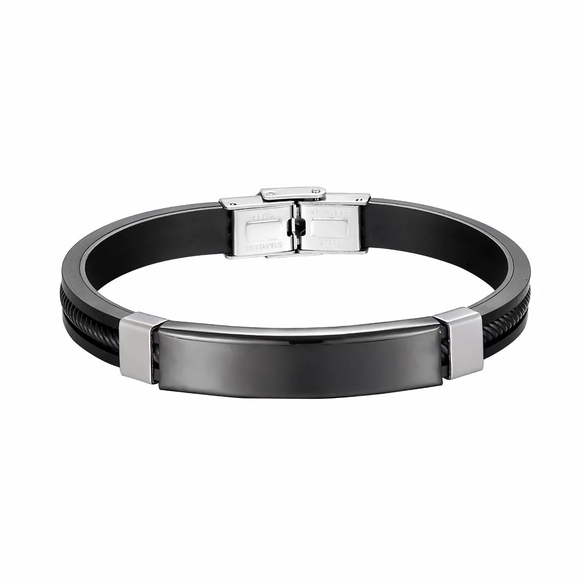 Realza tu estilo con esta moderna pulsera de acero inoxidable y silicona, diseñada tanto para hombres como para mujeres. Ya sea que busques añadir un toque de sofisticación a tu look diario o estés buscando el regalo perfecto, esta pulsera es una opción ideal. Con su elegante correa de silicona negra y su duradera construcción de acero inoxidable, esta pulsera tipo brazalete es a la vez moderna y funcional.Características del producto