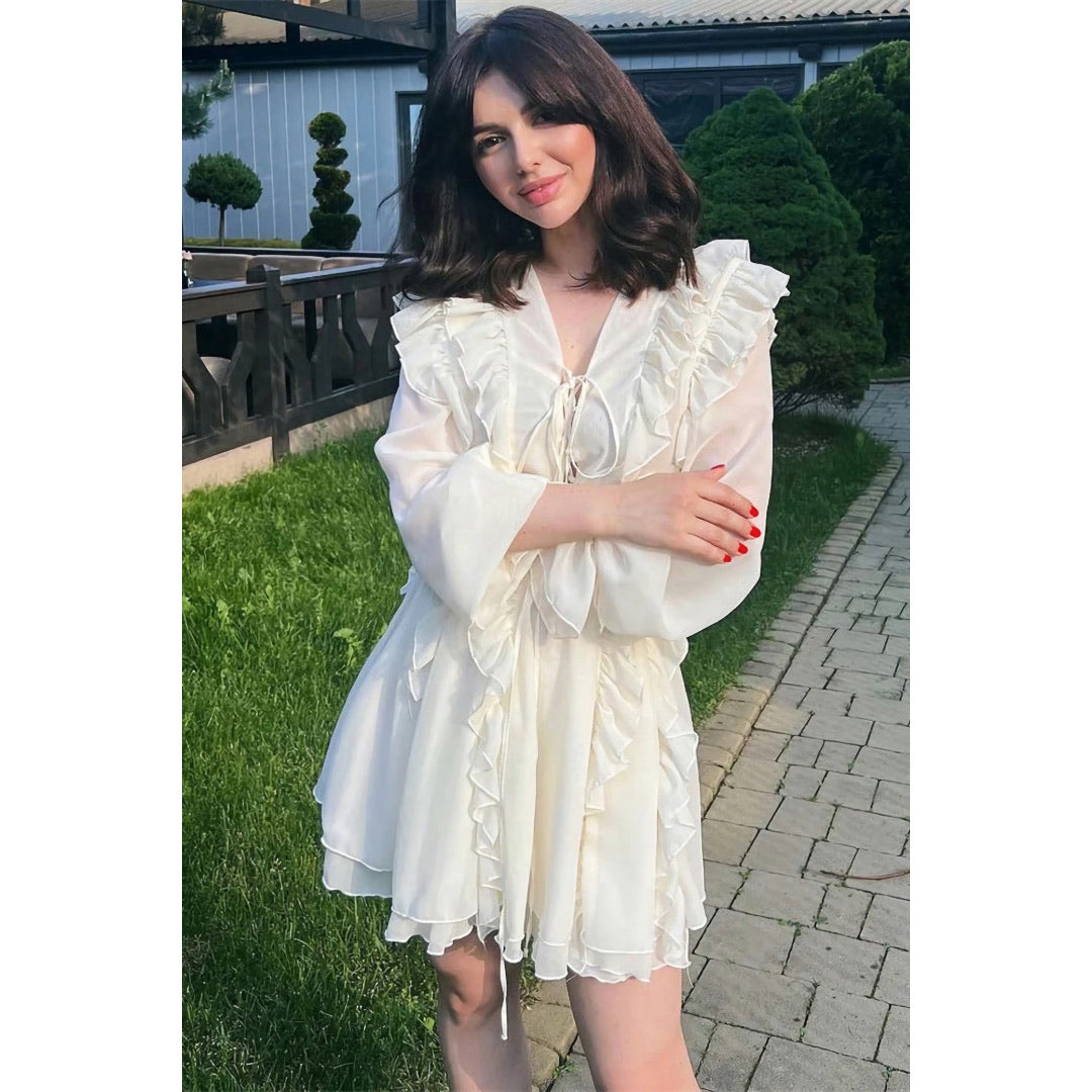 Da un paso hacia la elegancia del verano con el minivestido con volantes y cuello en V