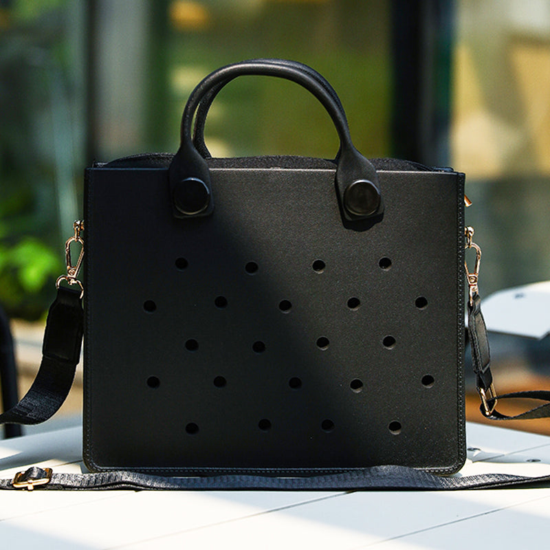 Este bolso tote, confeccionado con material EVA de alta calidad, ofrece un exterior resistente y duradero que resiste a los elementos. El bolso cuenta con un interior espacioso, perfecto para guardar toallas, bocadillos, protector solar y otras necesidades. La forma informal del bolso tote y el patrón sólido brindan un aspecto elegante y moderno, mientras que la falta de bolsillos interiores garantiza el máximo espacio para sus artículos. El bolso está diseñado sin cremallera, lo que ofrece un fácil acceso a sus pertenencias y una estética limpia y minimalista.