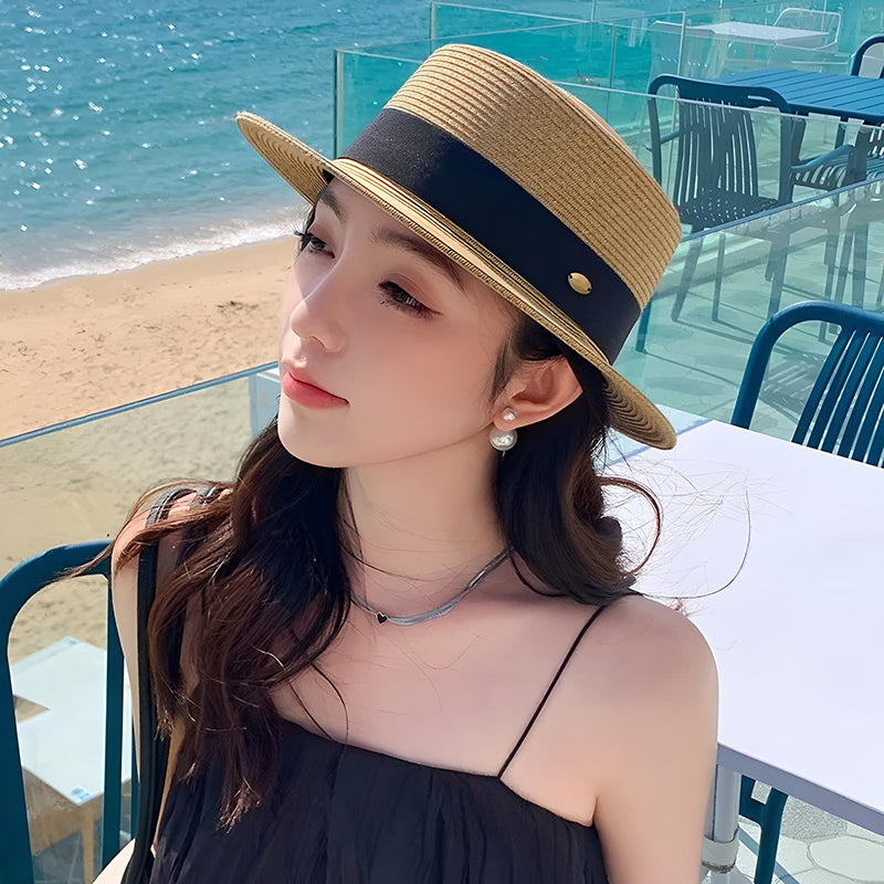 • Diseño elegante: presenta una elegante parte superior plana y una elegante cinta de café negro, que agrega un toque de sofisticación a tu look de verano.