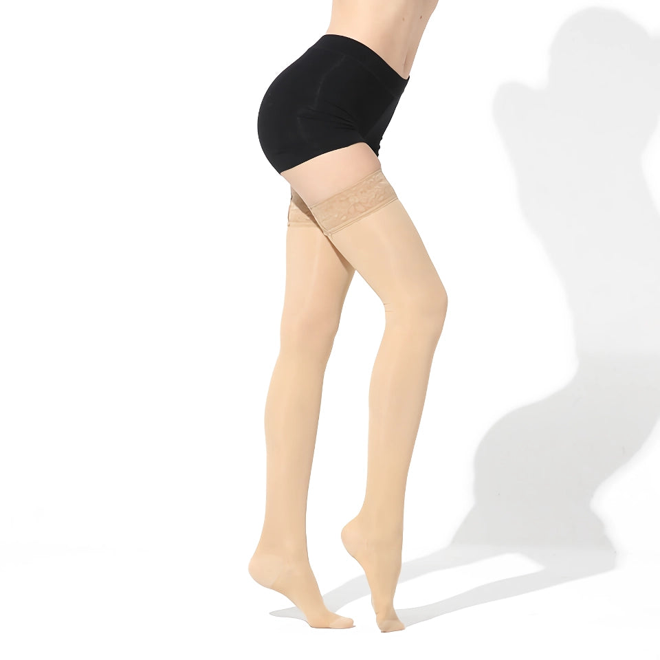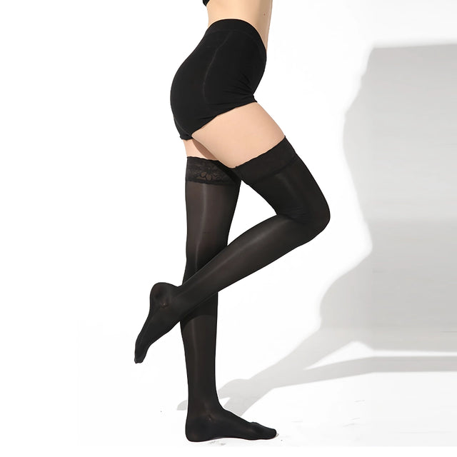 Estas medias hasta el muslo son perfectas para las mujeres que buscan aliviar las venas varicosas sin dejar de sentirse a la moda. La compresión graduada ayuda a mejorar la circulación sanguínea, reducir la hinchazón y aliviar las molestias, lo que las hace ideales para largas jornadas de trabajo, eventos sociales o incluso para relajarse en casa. La elegante banda de encaje añade un toque de elegancia, lo que garantiza que te sientas hermosa mientras cuidas tu salud. Lo que hace que estas medias sean realmente especiales es su combinación de funcionalidad y estilo. Están hechas de una mezcla de nailon y licra de alta calidad y ofrecen un ajuste cómodo que se mueve contigo durante todo el día. El material transpirable garantiza que te mantengas fresca, lo que las hace perfectas para usarlas en verano. Ya sea que te vistas elegantemente para salir por la noche o simplemente para hacer recados, estas medias harán que tus piernas se sientan bien y luzcan fabulosas.