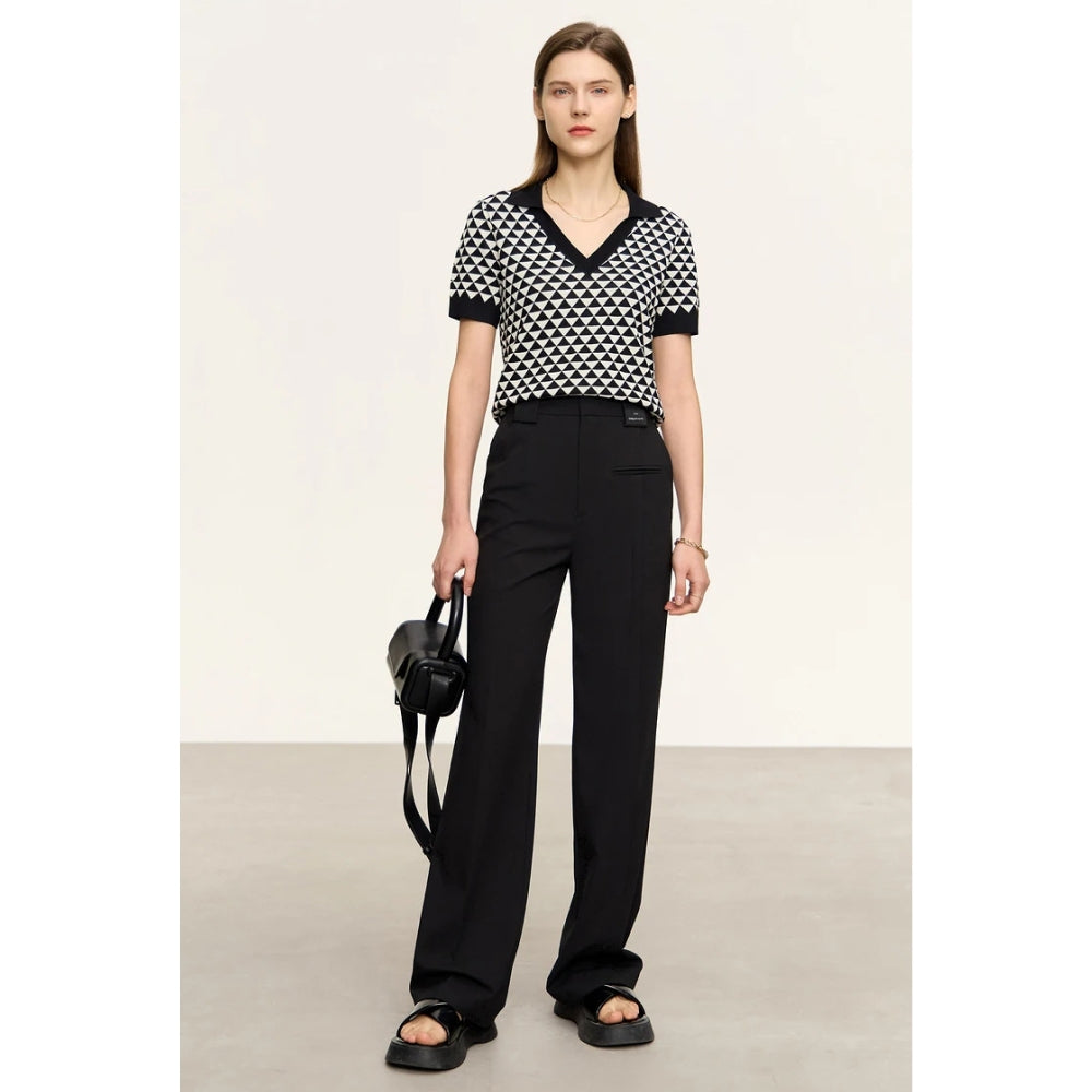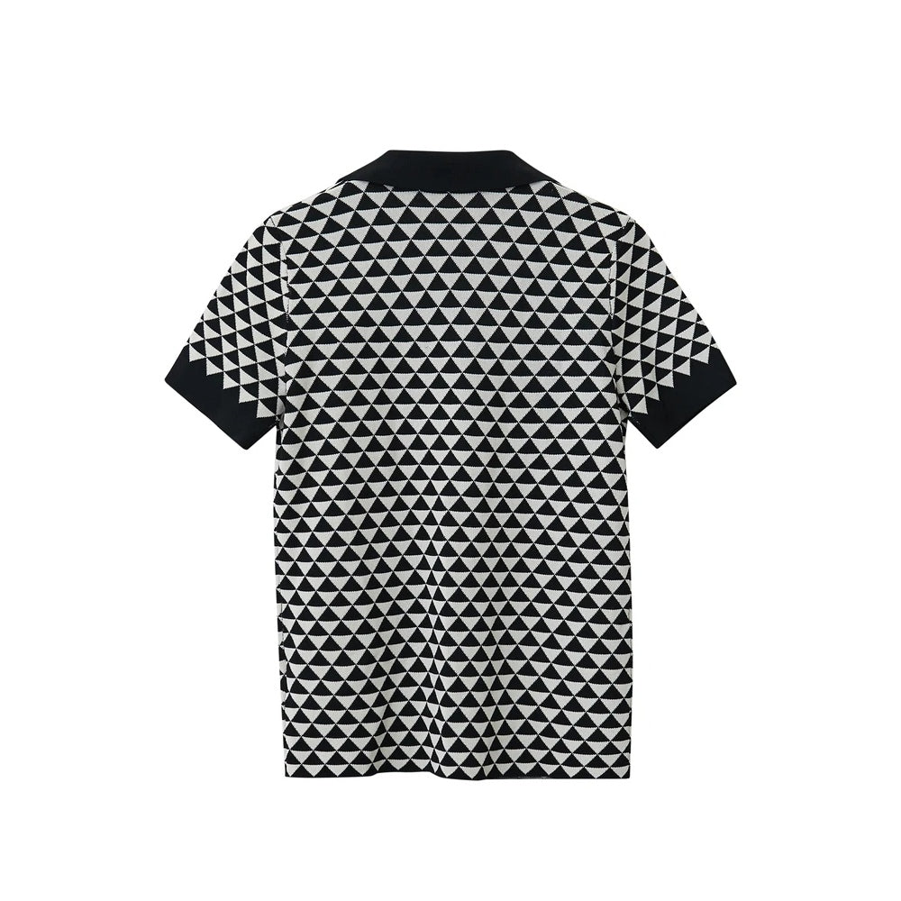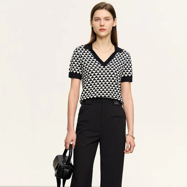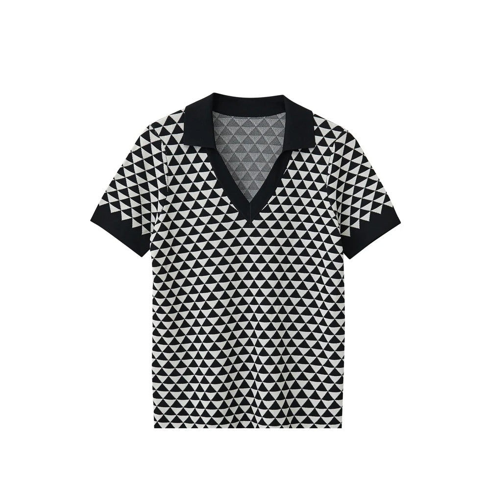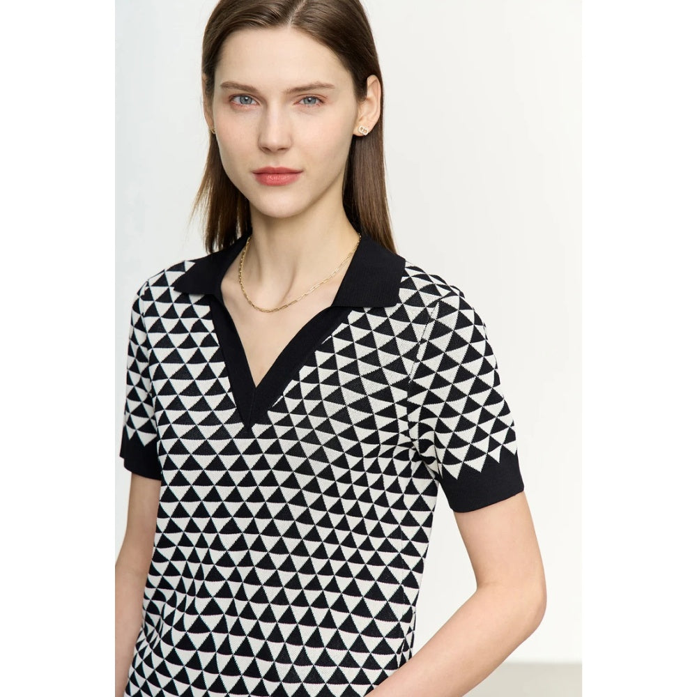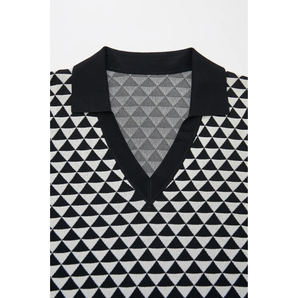 - Diseño: Estampado geométrico con escote en pico y cuello vuelto para un look sofisticado.